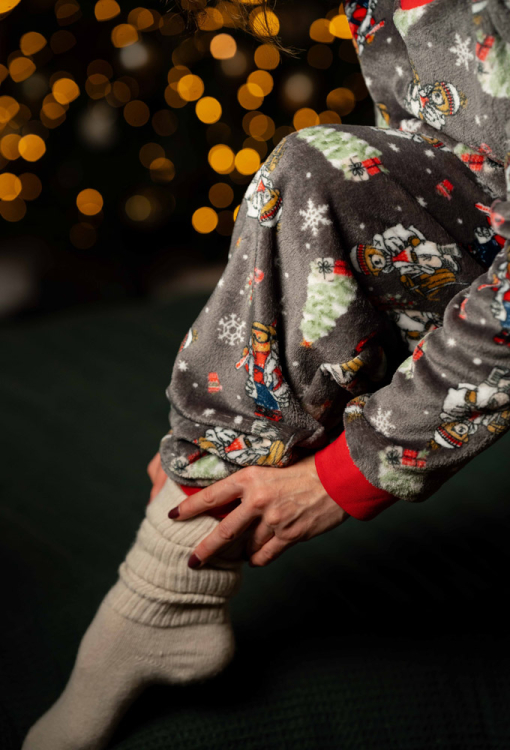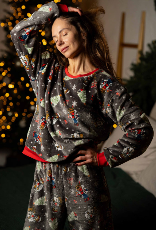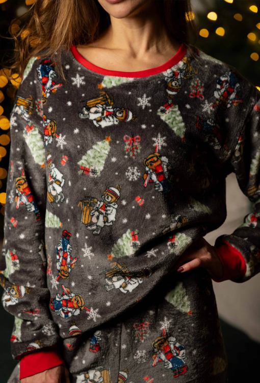 Яркая женская новогодняя пижама от украинского бренда German Volf. Пижама выполнена из качественного и мягкого велсофта, темно-серого цвета с принтом в виде мишек, елок и снежинок, состоит из кофты и штанов свободного силуэта. Кофта с длинными рукавами и круглым вырезом, рукава, низ и горловина модели обработаны однотонными манжетами красного цвета. Штаны с мягкой резинкой в поясе и трикотажными манжетами внизу. Пижама уютная и очень красивая, идеальный выбор для зимних вечеров и новогоднего отдыха, также станет прекрасным подарком близким людям.