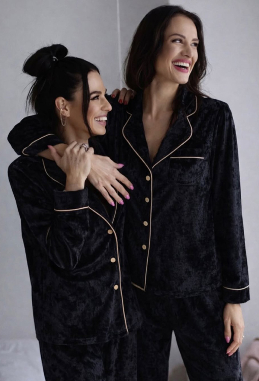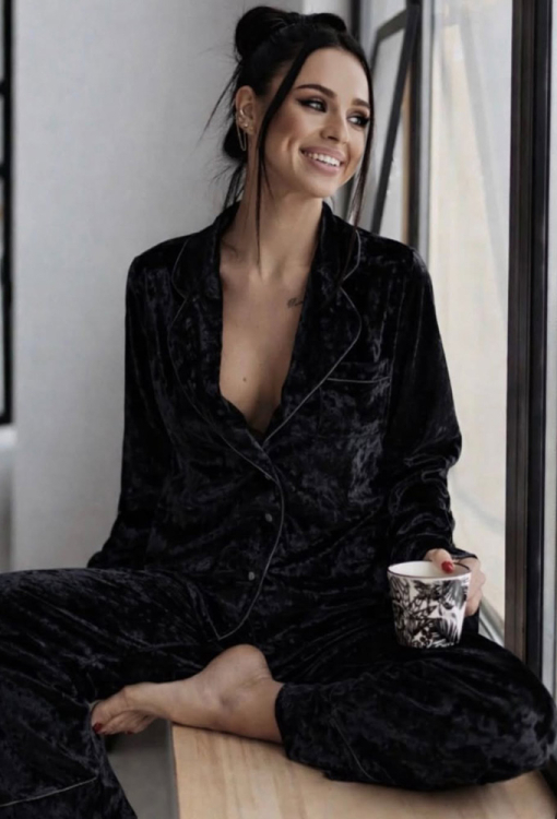 Роскошная женская зимняя пижама из коллекции Black Marble от украинского бренда Felena. Пижама выполнена из мягкого и качественного велюра черного цвета, состоит из рубашки и штанов. Рубашка прямого силуэта, с длинными рукавами, нагрудным карманчиком и отложным воротником, застегивается на пуговицы. Воротник, полки, рукава и карман модели обработаны тонким кантом кремового цвета. Штаны прямого кроя и с мягкой резинкой в поясе, внизу украшены тонким контрастным кантом. Пижама очень красивая и комфортная, также будет удобной домашней одеждой и прекрасным подарком любимому и близкому человеку.