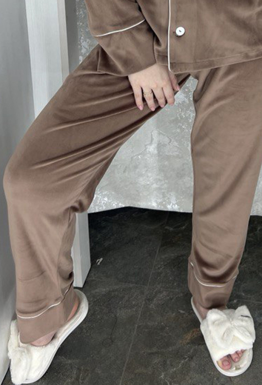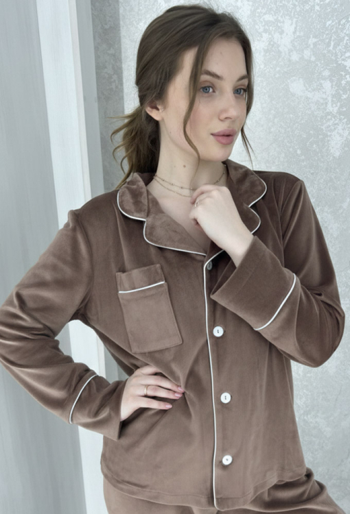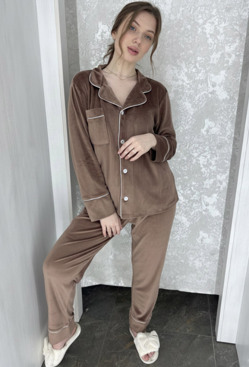 Женская зимняя пижама от украинского бренда BO.Brand. Пижама выполнена из качественного и мягкого велюра коричневого цвета, состоит из рубашки прямого силуэта и зауженных штанов. Рубашка с длинными рукавами и отложным воротником, застегивается на пуговицы, на груди украшена маленьким накладным карманчиком. Воротник, полки, рукава и карман модели украшены тонким кантом белого цвета. Штаны с удобной посадкой и мягкой резинкой в поясе, внизу также украшены белым кантом. Пижама красивая и очень комфортная, идеальна для холодных ночей и вечеров, а также может быть замечательным подарком любимому и близкому человеку.