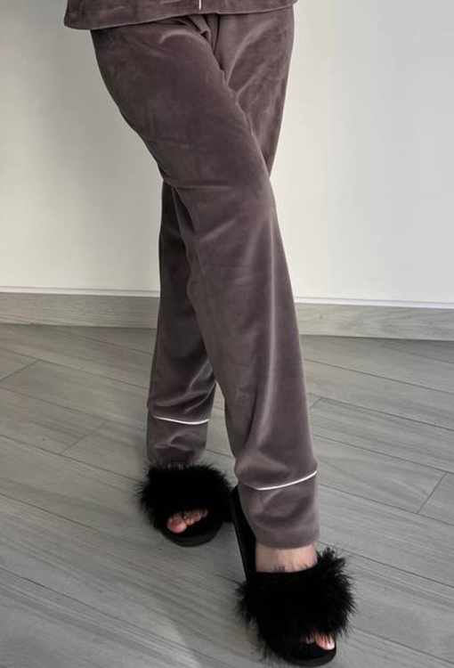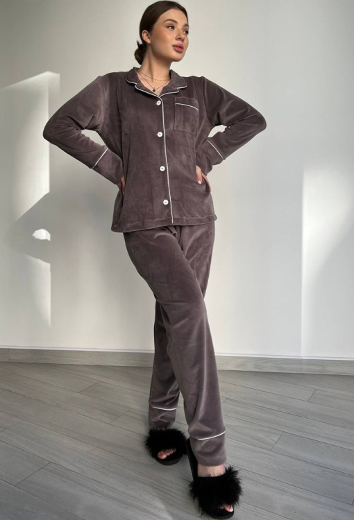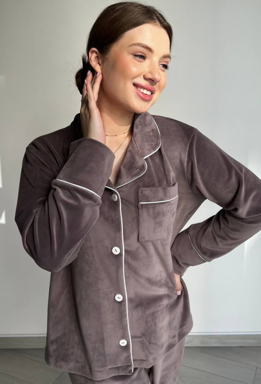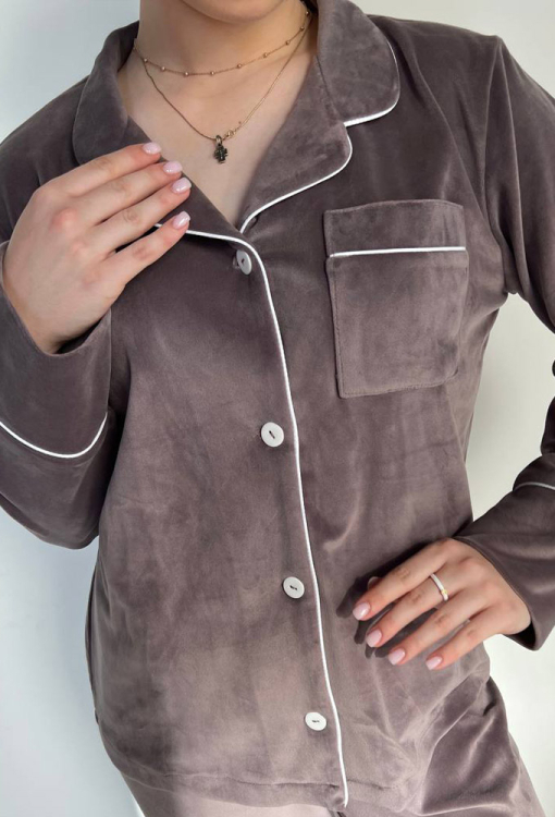 Нежная теплая зимняя пижама от украинского бренда BO.Brand. Пижама выполнена из качественного и мягкого велюра шоколадного цвета, состоит из рубашки прямого силуэта и зауженных штанов. Рубашка с длинными рукавами и отложным воротником, застегивается на пуговицы, на груди слева украшена маленьким накладным карманчиком. Воротник, полки, рукава и карман модели украшены тонким кантом белого цвета. Штаны с удобной посадкой и мягкой резинкой в поясе, внизу также украшены белым кантом. Пижама красивая и очень комфортная, идеальна для холодных ночей и вечеров, а также может быть замечательным подарком любимому и близкому человеку.