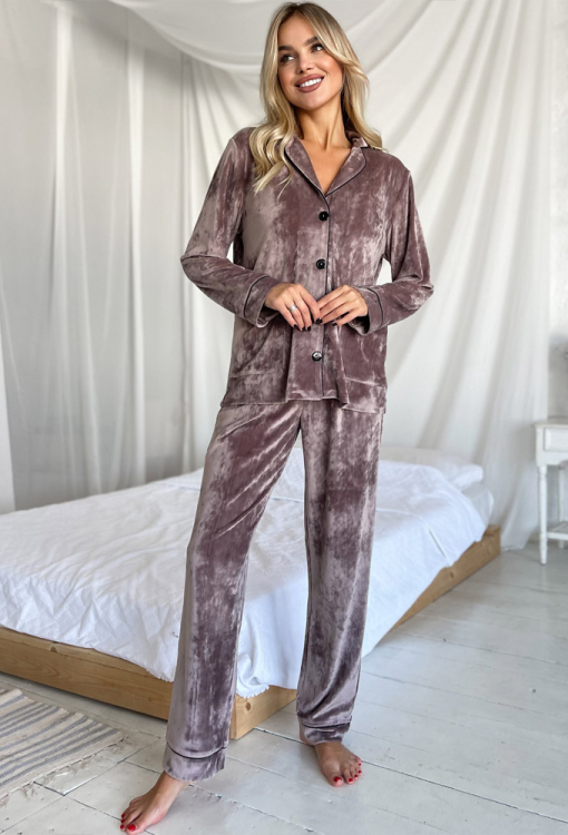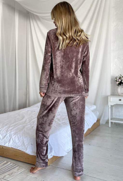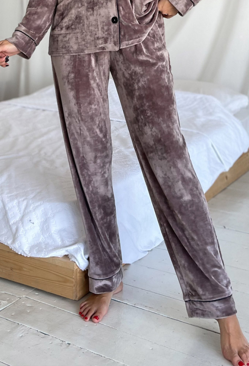 Элегантная женская зимняя пижама от украинского бренда Mi-Mi. Пижама выполнена из качественного и мягкого велюра цвета мокко, состоит из рубашки и прямых штанов. Рубашка свободного кроя, с длинными рукавами и отложным воротником, застегивается на пуговицы, по бокам два накладных кармана. Воротник, полки и рукава рубашки украшены кантом черного цвета. Штаны с мягкой резинкой в поясе, внизу обработаны тонким черным кантом. Пижама очень красивая и комфортная, можно использовать как одежду для дома, а также в качестве подарка любимому и близкому человеку.