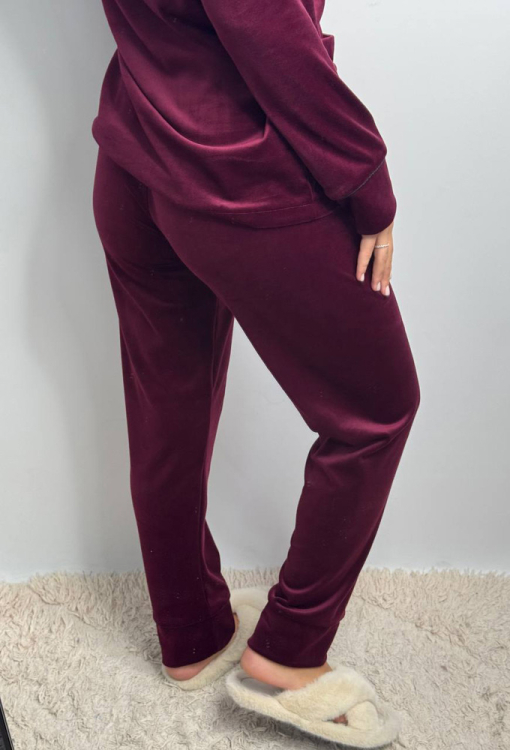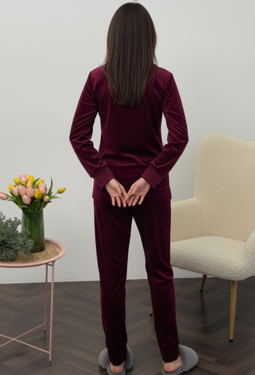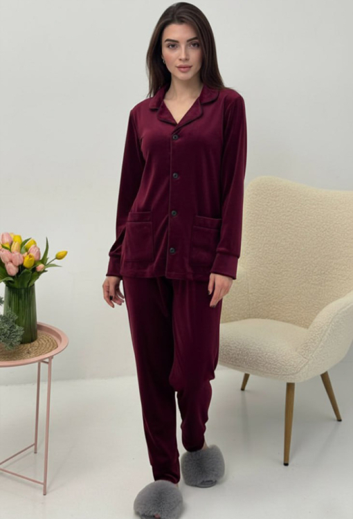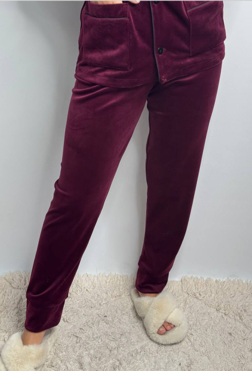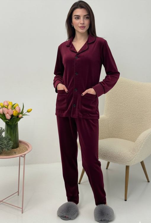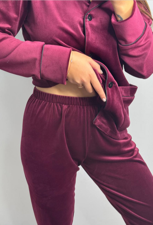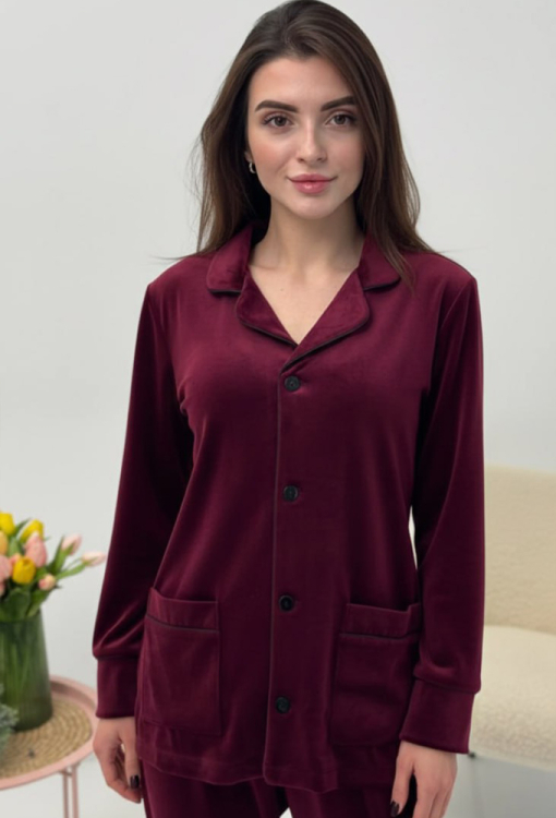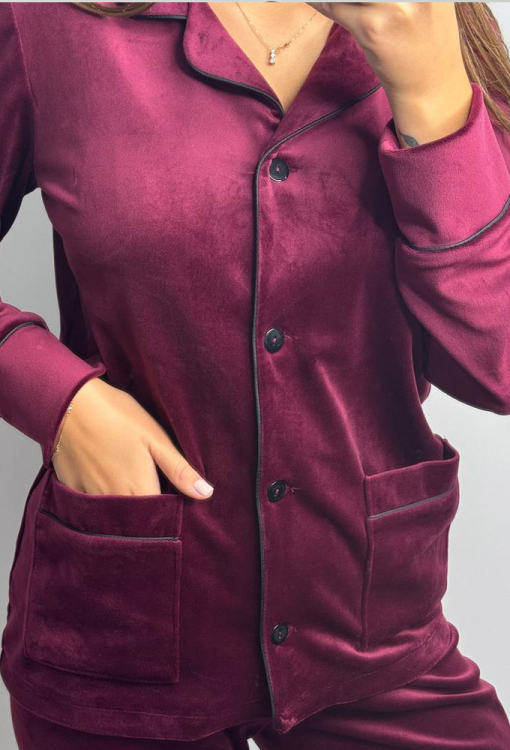 Нежная женская зимняя пижама от украинского бренда V.Velika - гармоничное сочетание элегантности, комфорта и уюта. Пижама выполнена из качественного и мягкого велюра бордового цвета, состоит из рубашки прямого силуэта и слегка зауженных штанов, создавая стильный домашний образ. Рубашка с длинными рукавами, отложным воротником и двумя накладными карманами застегивается на пуговицы, рукава обработаны свободными манжетами. Воротник, полки, рукава и карманы модели украшены тонким кантом черного цвета. Штаны с удобной посадкой и мягкой резинкой в поясе не сковывают движений, свободные манжеты внизу дарят максимальное удобство, тонкий черный кант по линии манжет создает завершенный образ. Пижама невероятно красивая и комфортная, идеальна как для сна, так и для уютного домашнего отдыха или подарка любиму и близкому человеку.