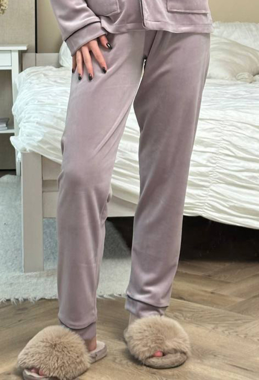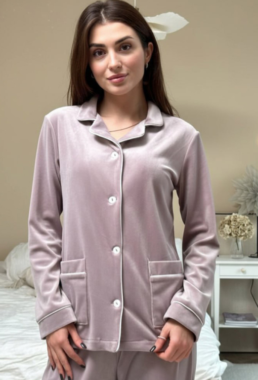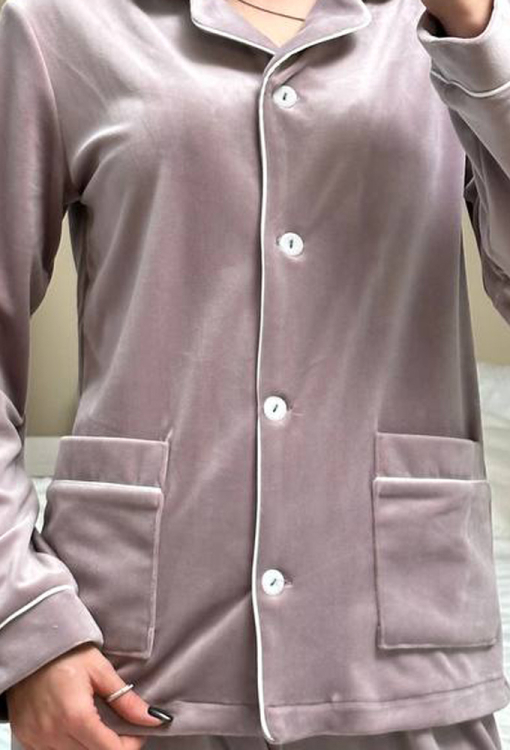 Элегантная женская зимняя пижама от украинского бренда V.Velika. Пижама выполнена из качественного и мягкого велюра пудрового цвета с перламутровым оттенком, состоит из рубашки прямого силуэта и зауженных штанов. Рубашка с длинными рукавами, отложным воротником и двумя накладными карманами застегивается на пуговицы, рукава обработаны свободными манжетами. Воротник, полки, рукава и карманы модели украшены тонким кантом белого цвета. Штаны с удобной посадкой и мягкой резинкой в поясе, внизу обработаны свободными манжетами и тонким контрастным кантом. Пижама невероятно красивая и комфортная, идеальна как для сна, так и для уютного домашнего отдыха или подарка любиму и близкому человеку.