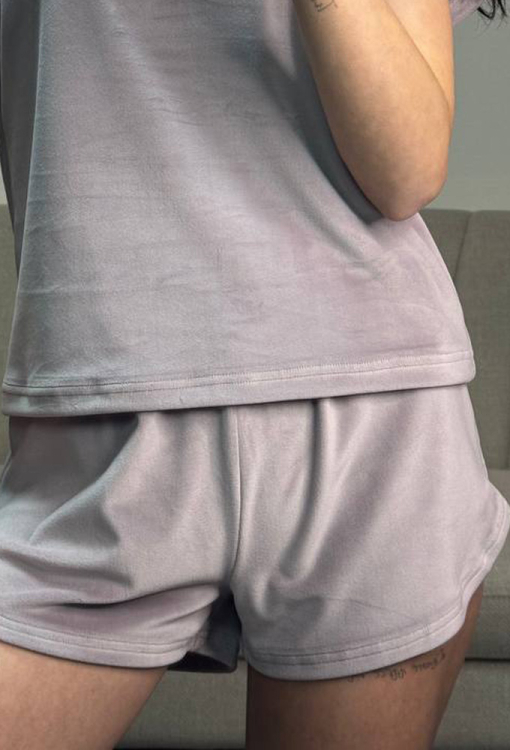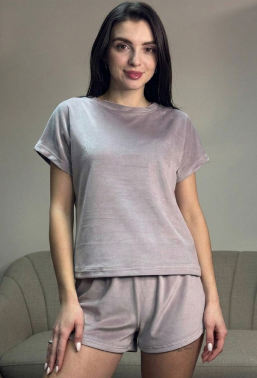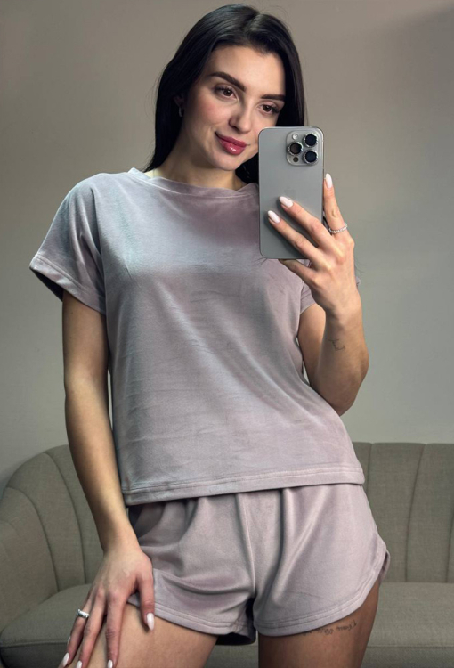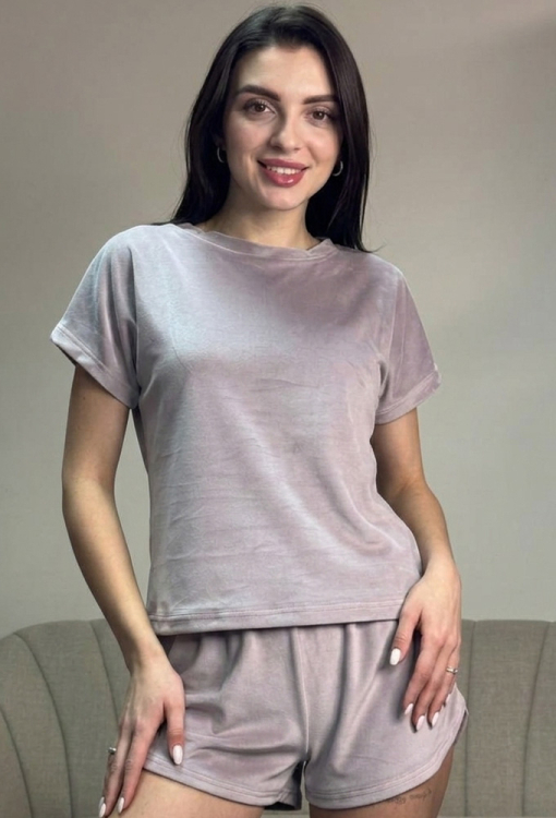Легкая женская пижама от украинского бренда V.Velika. Пижама выполнена из качественного и мягкого велюра цвета перламутровой пудры, состоит из футболки свободного силуэта и коротких шорт с высокими закругленными разрезами. Футболка с цельнокроенными короткими рукавами и небольшим круглым вырезом горла обеспечивает свободу движений. Шорты с удобной посадкой и мягкой резинкой в поясе. Пижама невероятно красивая и приятная к телу, идеально подходит для сна и уютного домашнего отдыха, а также может быть замечательным подарком для любимого и близкого человека.