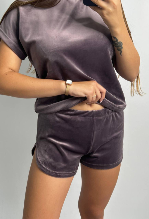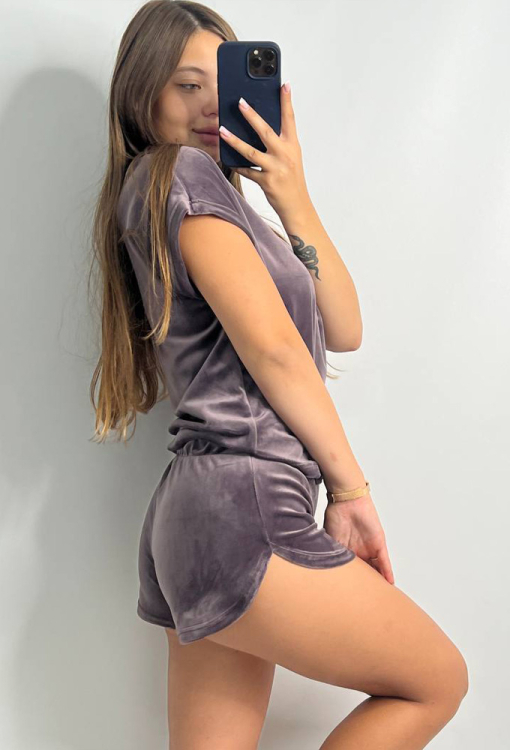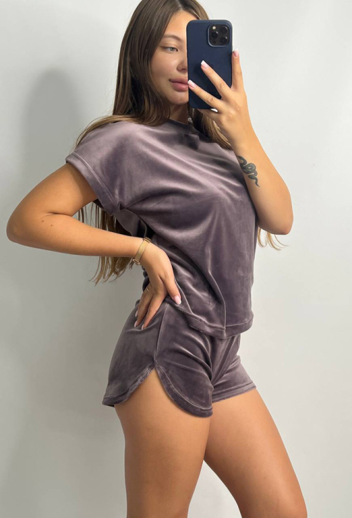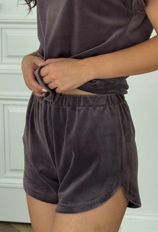 Привлекательная женская пижама от украинского бренда V.Velika. Пижама выполнена из качественного и мягкого велюра шоколадного цвета, состоит из футболки свободного силуэта и коротких шорт с высокими закругленными разрезами. Футболка с цельнокроенными короткими рукавами и небольшим круглым вырезом горла обеспечивает свободу движений. Шорты с удобной посадкой и мягкой резинкой в поясе. Пижама невероятно красивая и приятная к телу, идеально подходит для сна и уютного домашнего отдыха, а также может быть замечательным подарком для любимого и близкого человека.