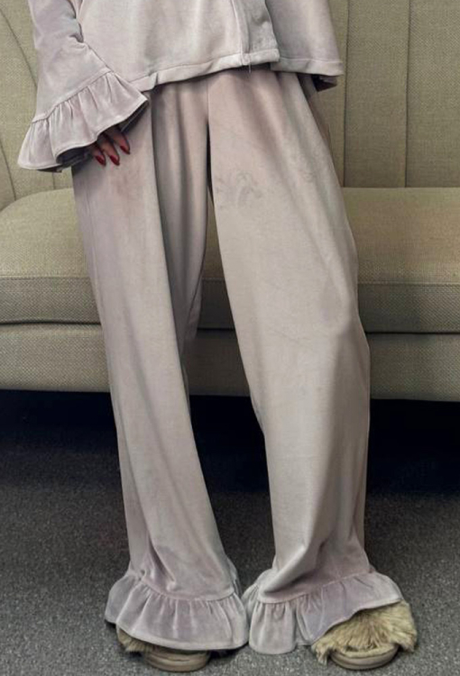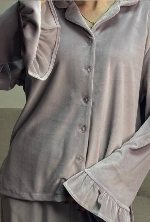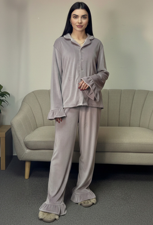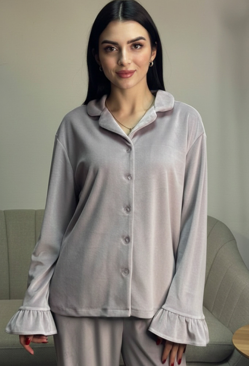 Шикарная женская зимняя пижама от украинского бренда V.Velika. Пижама выполнена из качественного и мягкого велюра пудрового цвета с перламутровым оттенком, состоит из рубашки и штанов свободного силуэта в стиле oversize. Рубашка с длинными рукавами, отложным воротником и небольшими боковыми разрезами, застегивается на пуговицы, рукава обработаны рюшами. Штаны с удобной посадкой и мягкой резинкой в поясе, внизу украшены широкими оборками. Пижама невероятно красивая и комфортная, идеальна как для сна, так и для очаровательного домашнего образа или подарка любиму и близкому человеку.