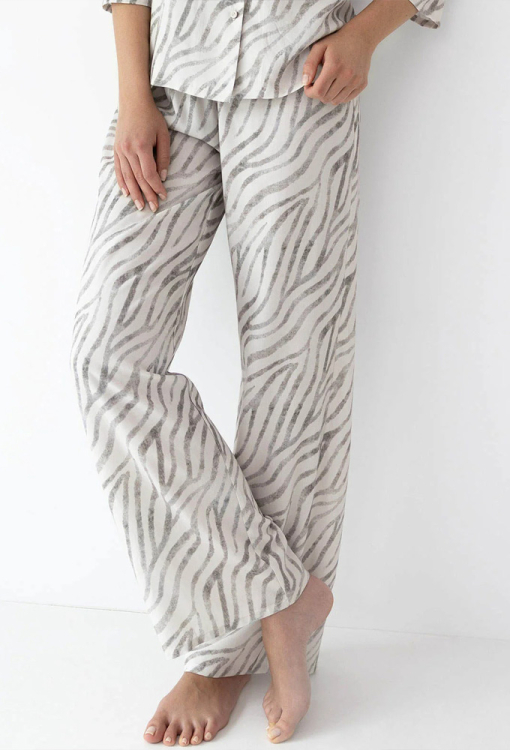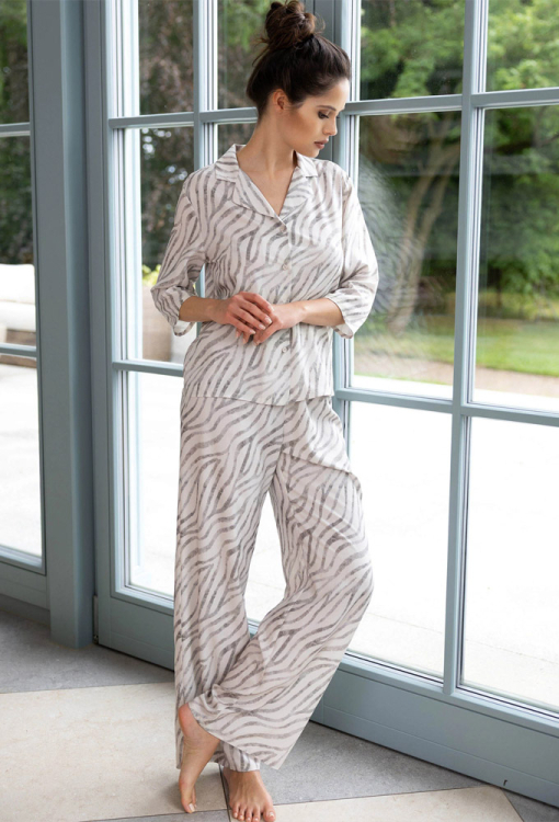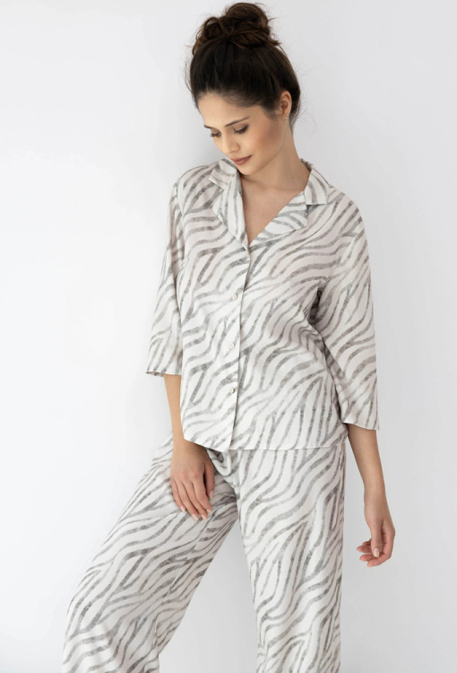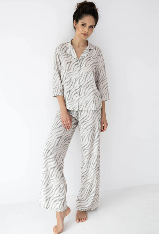 Стильная женская пижама Emory от польского бренда Sensis. Пижама выполнена из качественной и мягкой вискозы кремового цвета с серым тигровым принтом, состоит из рубашки и штанов свободного силуэта. Рубашка с рукавами 3/4 и отложным воротником, застегивается на пуговицы, штаны с мягкой резинкой в поясе. Пижама очень красивая и комфортная, также будет удобной одеждой для дома или замечательным подарком любимому и близкому человеку!