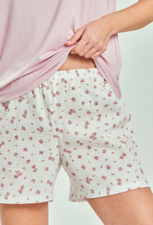Летняя женская пижама Felisia от польского бренда Taro. Пижама выполнена из качественного и мягкого материала, состоит из вискозной футболки розового цвета и белых хлопковых шорт в мелкий цветочный принт. Футболка прямого силуэта, с короткими рукавами и V-образным вырезом горла, шорты также прямого кроя и с мягкой резинкой в поясе. Пижама очень красивая и комфортная, подходит как для сна, так и для домашнего отдыха, также может быть замечательным подарком любимому или близкому человеку.
