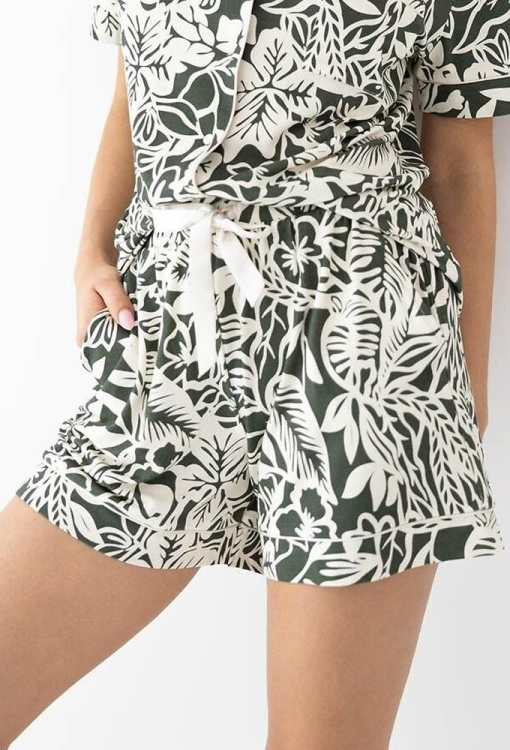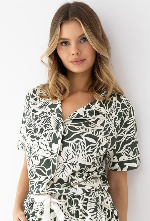 Классическая женская пижама Kaylee от польского бренда Sensis. Пижама выполнена из качественной и мягкой вискозы темно-зеленого цвета с белым цветочным принтом, состоит из рубашки и шорт прямого силуэта. Рубашка с короткими рукавами и отложным воротником, застегивается на пуговицы. На груди слева модель украшена маленьким накладным карманчиком, воротник, полки, рукава и карман обработаны тонким кантом белого цвета. Шорты с мягкой резинкой в поясе и удобными боковыми карманами, украшены атласной лентой на талии. Пижама очень красивая и комфортная, также будет удобной одеждой для дома или замечательным подарком любимому и близкому человеку!