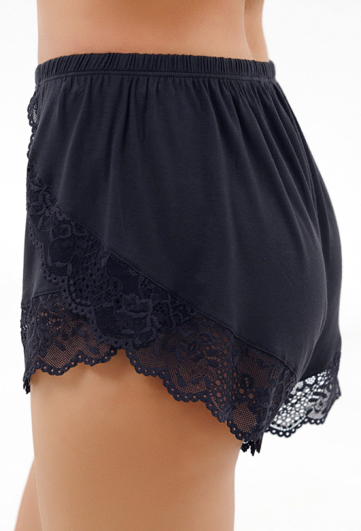 Соблазнительная женская пижама из коллекции La Nuit от украинского бренда Leinle. Пижама выполнена из мягкой и качественной вискозы, графитового цвета, состоит из майки и коротких шорт. Майка свободного силуэта на тонких регулируемых бретелях и с V-образным декольте, вырез украшен вставками из ажурного кружева. Шорты с мягкой резинкой в поясе, внизу также обработаны кружевными вставками.