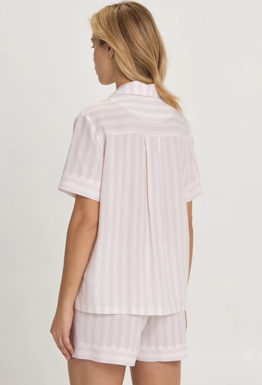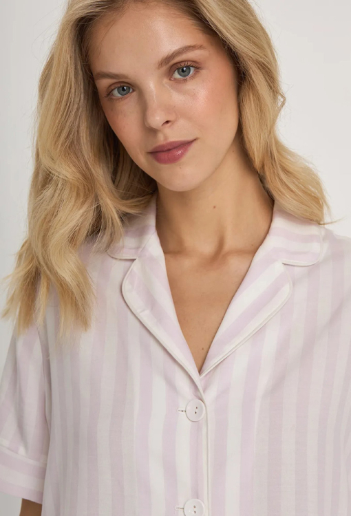 Удобная женская пижама из коллекции Provence от украинского бренда Ellen. Пижама выполнена из качественной и мягкой вискозы, фиолетового цвета в белый полосатый принт, состоит из рубашки и шорт. Рубашка прямого кроя, с короткими рукавами и отложным воротником, застегивается на пуговицы, рукава обработаны свободными манжетами, воротник и полки украшены тонким кантом белого цвета. Шорты с мягкой резинкой в поясе, внизу на манжетах. Пижама очень красивая и комфортная, также станет любимой частью твоей домашней рутины или замечательным подарком близкому человеку.