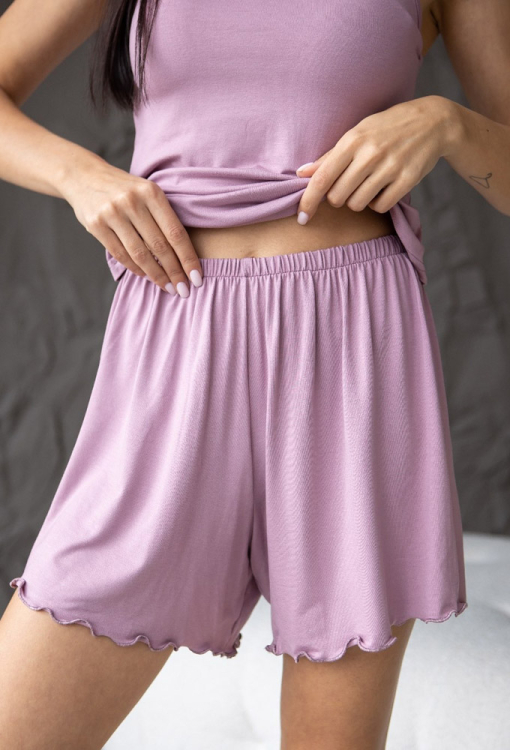 Легкая женская пижама от украинского бренда MiaNaGreen. Пижама выполненная из мягкой и качественной вискозы сиреневого цвета, состоит из майки и шорт. Майка полуприлегающего силуэта, на тонких регулируемых бретелях и с круглым декольте, шорты свободного кроя и с мягкой резинкой в поясе, внизу обработаны декоративным швом. Пижама очень красивая и приятная к телу, идеальный вариант для сна и домашнего отдыха, а также может быть хорошим подарком близким людям!