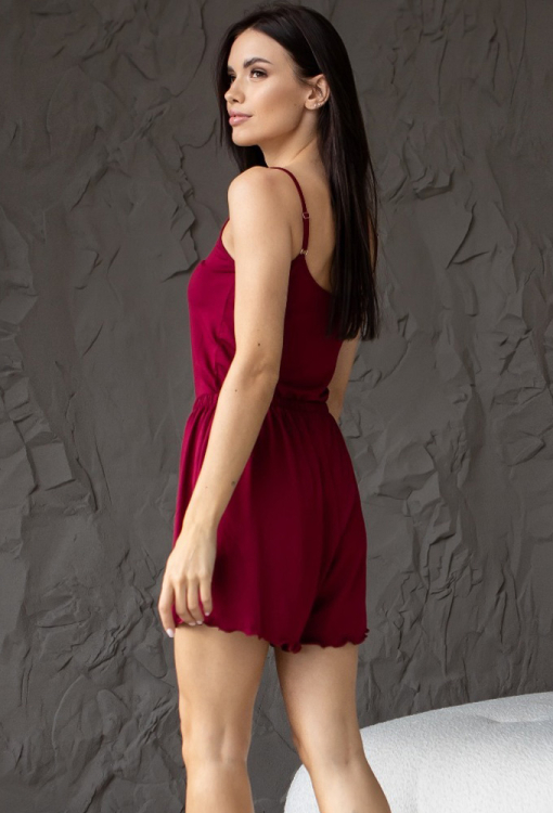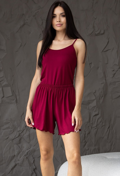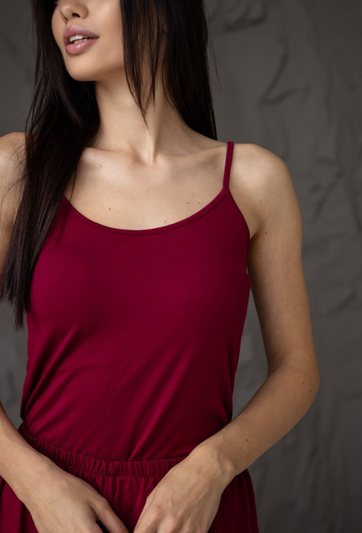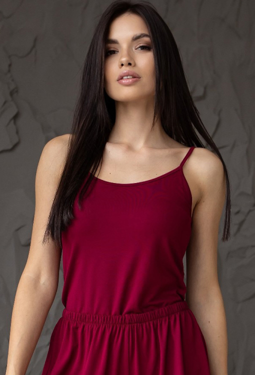 Легкая женская пижама от украинского бренда MiaNaGreen. Пижама выполненная из мягкой и качественной вискозы бордового цвета, состоит из майки и шорт. Майка полуприлегающего силуэта, на тонких регулируемых бретелях и с круглым декольте, шорты свободного кроя и с мягкой резинкой в поясе, внизу обработаны декоративным швом. Пижама очень красивая и приятная к телу, идеальный вариант для сна и домашнего отдыха, а также может быть хорошим подарком близким людям!