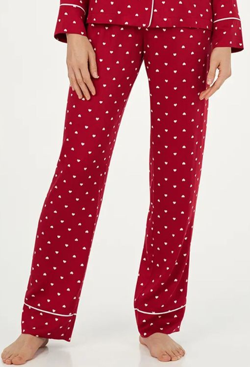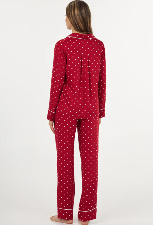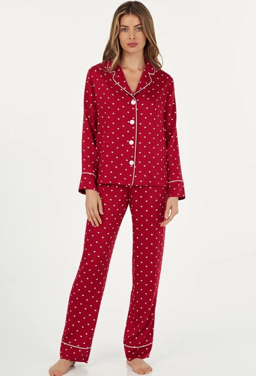 Романтичная женская пижама из коллекции Red Love от украинского бренда Ellen. Пижама выполнена из качественной и мягкой вискозы, красного цвета в принт из мелких сердечек белого цвета, состоит из рубашки и штанов прямого силуэта. Рубашка с длинными рукавами и отложным воротником, застегивается на пуговицы. Спинка модели обработана кокеткой и продольными складками, воротник, полки и рукава украшены тонким кантом белого цвета. Штаны с удобной посадкой и мягкой резинкой в поясе, внизу оформлены контрастным кантом. Пижама очень красивая и комфортная, также может быть отличной одеждой для дома или полезным подарком любимому и близкому человеку.