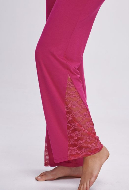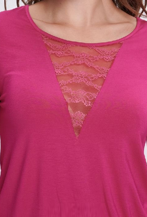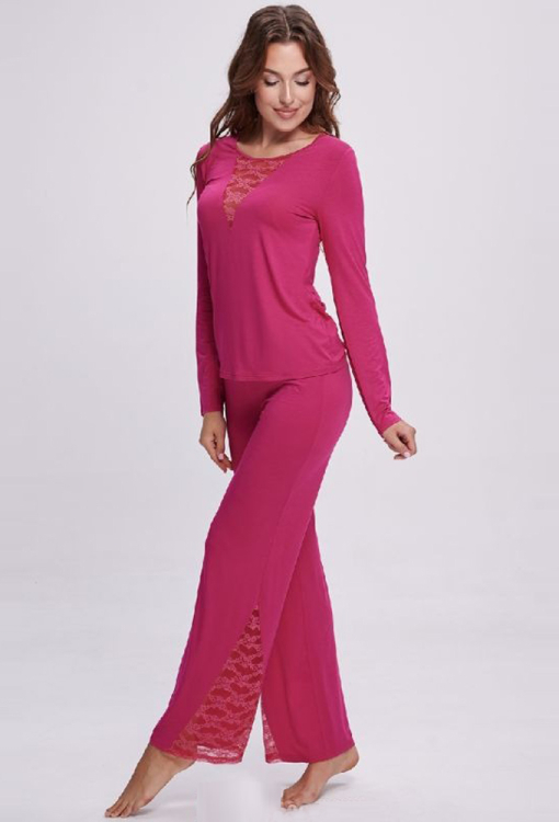 Удобная и приятная к телу женская пижама от украинского бренда Shato. Пижама выполнена из качественной и мягкой вискозы малинового цвета, состоит из кофты и штанов прямого силуэта. Кофта с длинными рукавами и круглым вырезом горла, вверху украшена V-образной вставкой из ажурного кружева. Штаны с мягкой резинкой в поясе, по бокам внизу также украшены кружевными вставками треугольной формы. Пижама очень красивая и комфортная, идеальна для сна и домашнего отдыха, а также может быть замечательным подарком любимому и близкому человеку.