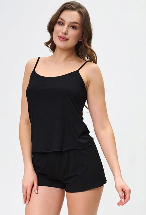 Изящная женская пижама от украинского бренда Shato. Пижама выполнена из качественной и мягкой вискозы черного цвета, состоит из майки и коротких шортов. Майка полуприлегающего силуэта, с тонкими регулируемыми бретелями и круглым декольте, внизу украшена декоративным плоским швом. шорты прямого кроя с удобной посадкой и мягкой резинкой в поясе, внизу обработаны волнистой отделкой. Пижама очень красивая и комфортная, подойдет для сна и домашнего отдыха, также может быть замечательным подарком любимому и близкому человеку.