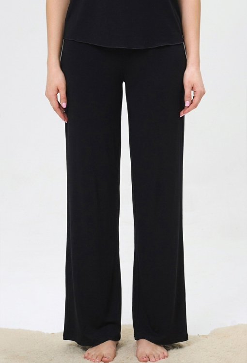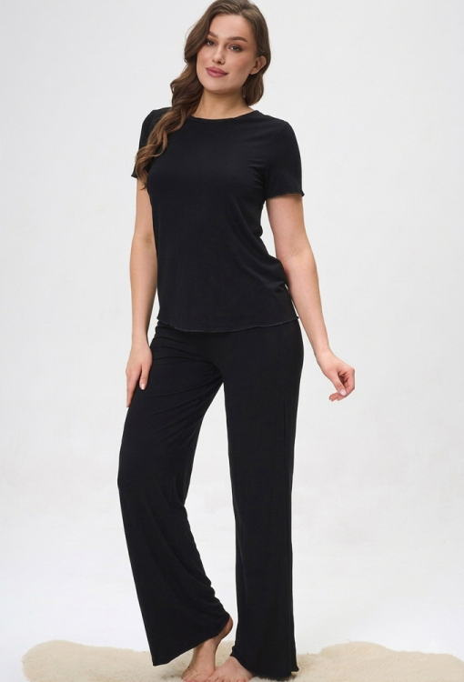 Удобная женская пижама от украинского бренда Shato. Пижама выполнена из качественной и мягкой вискозы черного цвета, состоит из футболки и штанов. Футболка полуприлегающего силуэта, с короткими рукавами и круглым вырезом горла. Рукава и низ модели украшены волнистым швом. Штаны прямого кроя с удобной посадкой и мягкой резинкой в поясе. Пижама очень красивая и комфортная, подойдет для сна и домашнего отдыха, также может быть замечательным подарком любимому и близкому человеку.