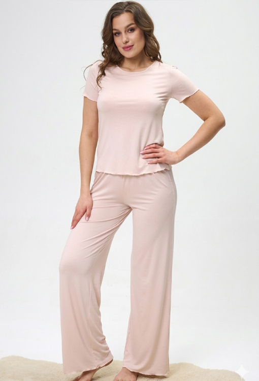 Удобная женская пижама от украинского бренда Shato. Пижама выполнена из качественной и мягкой вискозы нежно-розового цвета, состоит из футболки и штанов. Футболка полуприлегающего силуэта, с короткими рукавами и круглым вырезом горла. Рукава и низ модели украшены волнистым швом. Штаны прямого кроя с удобной посадкой и мягкой резинкой в поясе. Пижама очень красивая и комфортная, подойдет для сна и домашнего отдыха, также может быть замечательным подарком любимому и близкому человеку.