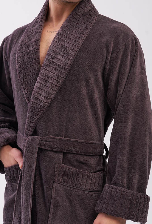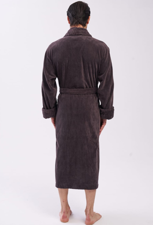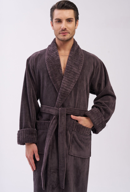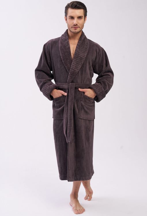Елегантний чоловічий халат від турецького бренду Nusa. Халат виконаний з м'якого та якісного матеріалу коричневого кольору, велюровий зовні та махровий усередині, з довгими рукавами на відкладних манжетах та коміром шаль. Модель зі зручними накладними кишенями та довжиною нижче колін, зав'язується на запах за допомогою пояса. Комір та манжети виробу виконані з фактурної тканини в смужку, кишені прикрашені такими ж вставками. Халат дуже гарний і приємний до тіла, відмінно вбирає вологу і дозволяє тілу дихати, ідеальний після ванної, басейну або тренажерного залу, а також може бути корисним подарунком коханій та близькій людині.