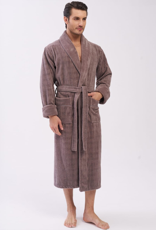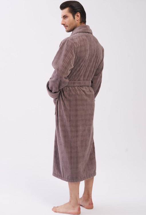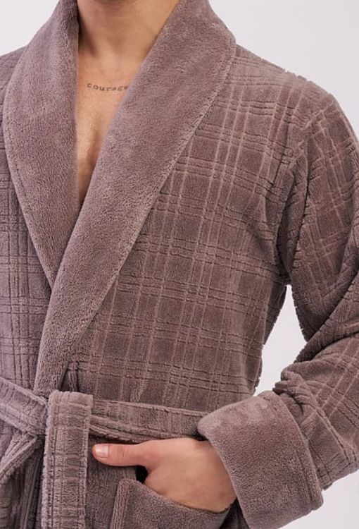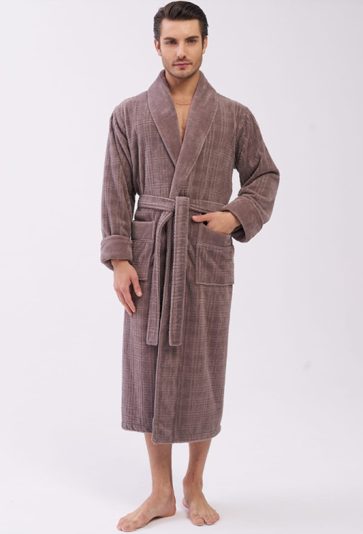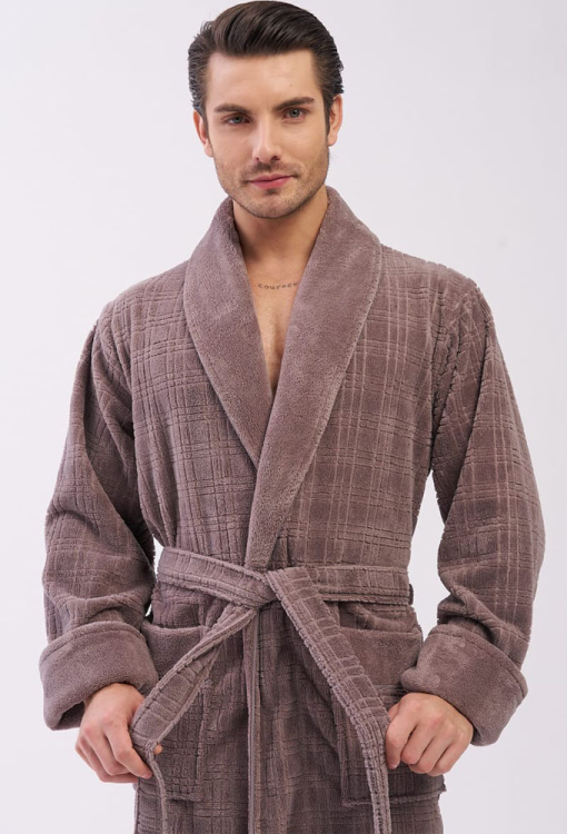 Класичний чоловічий халат від турецького бренду Nusa. Халат виконаний з м'якого та якісного матеріалу коричневого кольору, велюровий з тисненою картатою фактурою зовні та махровий усередині, з довгими рукавами на відкладних манжетах та коміром шаль. Модель зі зручними накладними кишенями та довжиною нижче колін, зав'язується на запах за допомогою пояса. Комір та манжети виробу виконані з однотонної гладкої тканини, кишені прикрашені такими ж вставками. Халат дуже гарний і приємний до тіла, відмінно вбирає вологу і дозволяє тілу дихати, ідеальний після ванної, басейну або тренажерного залу, а також може бути корисним подарунком коханій та близькій людині.