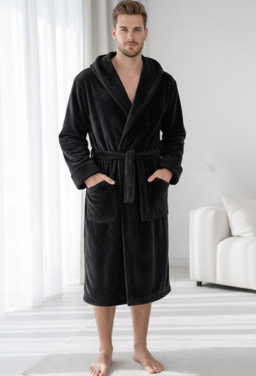 Теплий чоловічий халат Cuddle від українського бренду Cosy. Халат виконаний з якісного та м'якого велсофту чорного кольору, вільного силуету та довжиною нижче колін. Модель з довгими рукавами, капюшоном і зручними бічними кишенями, зав'язується на запах за допомогою пояса. Рукави виробу оброблені вільними манжетами, за рахунок яких регулюється довжина. Халат красивий і дуже комфортний, ідеальний для холодних зимових вечорів будинку, а також підійде як подарунок коханій або близькій людині.