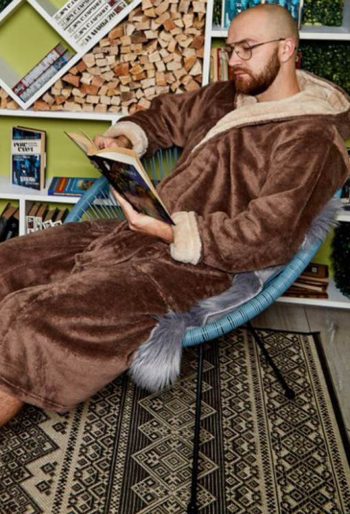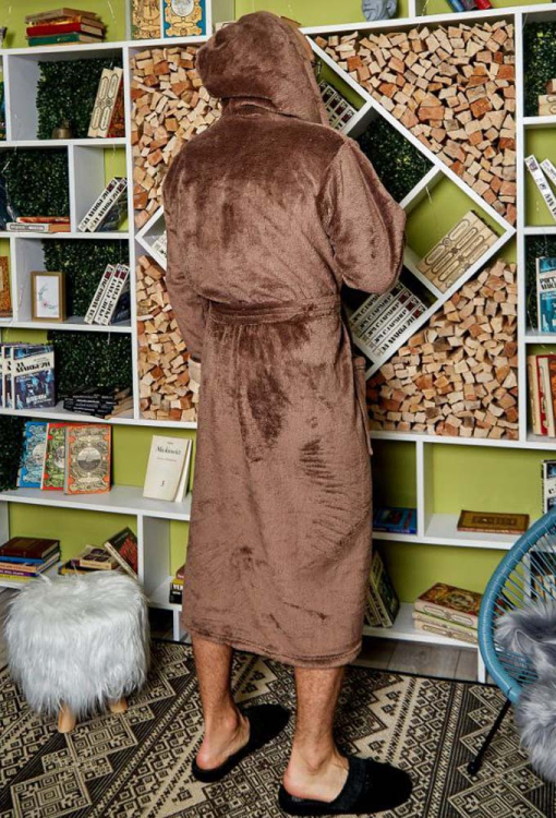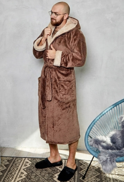 Теплий та приємний до тіла чоловічий халат від українського бренду Tomiko. Халат виконаний з м'якого та якісного велсофту кольору молочний шоколад, з довгими рукавами та капюшоном. Модель довжиною нижче колін й зі зручними накладними кишенями, зав'язується на запах за допомогою пояса. Капюшон всередині та відкладні манжети моделі виконані із велсофту кольору капучино. Халат дуже красивий і комфортний, ідеальний після ванної, басейну та для домашнього затишку, а також може бути чудовим подарунком коханій чи близькій людині.
