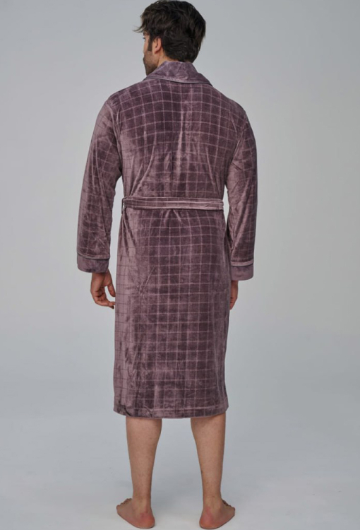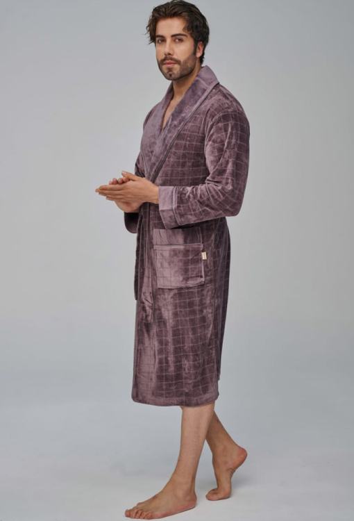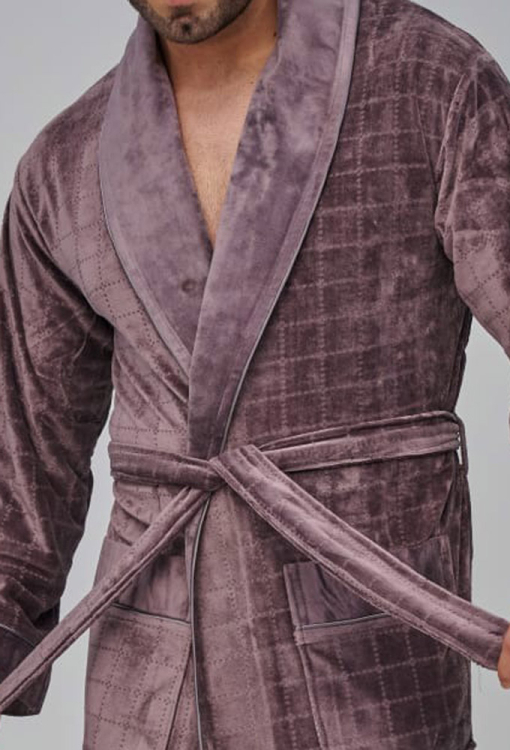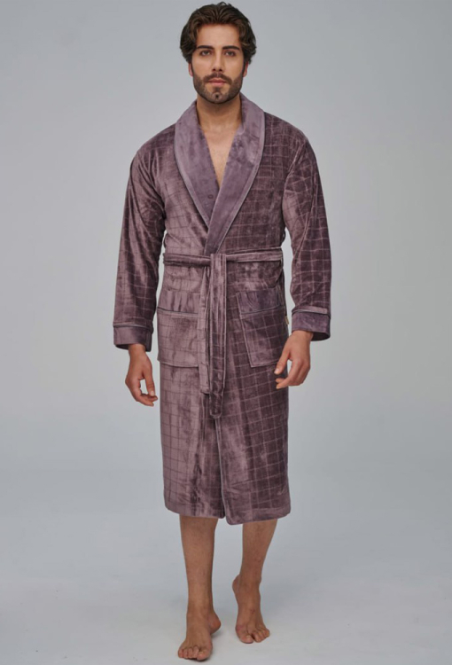 Елегантний чоловічий халат від турецького бренду Nusa. Халат виконаний з м'якого та якісного велюру, коричневого кольору з тисненою фактурою в клітинку, з довгими рукавами та коміром шаль. Модель довжиною нижче колін і зі зручними накладними кишенями, зав'язується на запах за допомогою пояса. Комір та манжети на рукавах виконані з однотонного гладкого велюру та прикрашені тонким кантом, кишені також оброблені однотонними вставками та кантом. Халат дуже зручний і приємний до тіла, відмінно вбирає вологу і дозволяє тілу дихати, ідеальний після ванни, басейну або тренажерного залу, а також може бути корисним подарунком коханій та близькій людині.