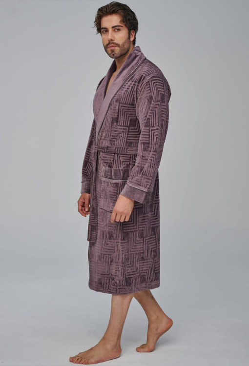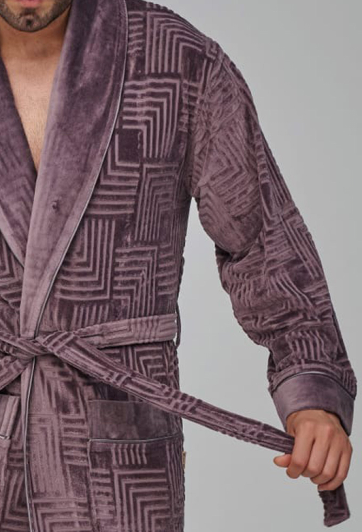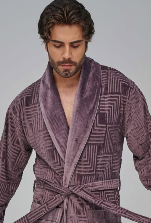 Елегантний чоловічий халат від турецького бренду Nusa. Халат виконаний з м'якого та якісного велюру, коричневого кольору з тисненою фактурою з орнаменту, з довгими рукавами та коміром шаль. Модель довжиною нижче колін і зі зручними накладними кишенями, зав'язується на запах за допомогою пояса. Комір та манжети на рукавах виконані з однотонного гладкого велюру та прикрашені тонким кантом, кишені також оброблені однотонними вставками та кантом. Халат дуже зручний і приємний до тіла, відмінно вбирає вологу і дозволяє тілу дихати, ідеальний після ванни, басейну або тренажерного залу, а також може бути корисним подарунком коханій та близькій людині.