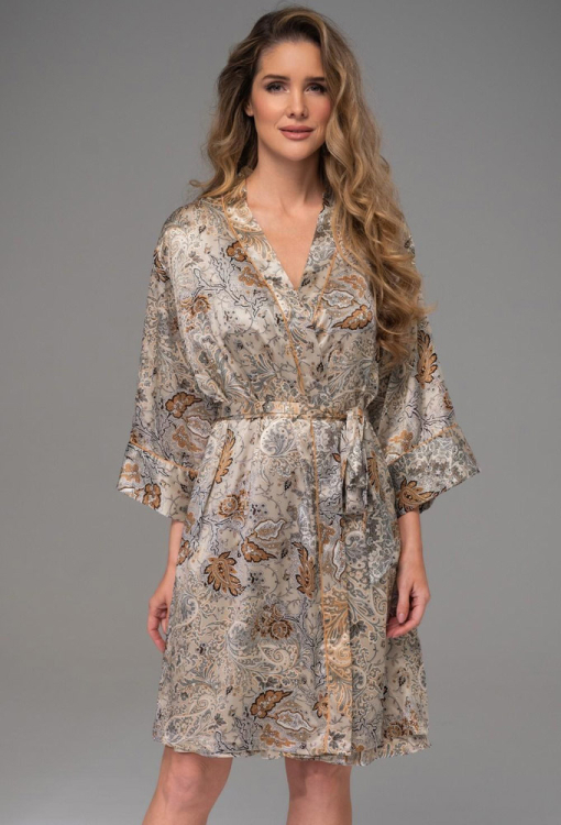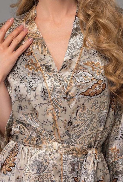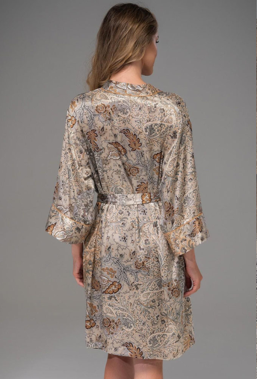 Красивий жіночий халат із колекції Livia від італійського бренду Mia-Amore. Халат виконаний із сумішевого полотна на основі натурального шовку, бежевого кольору в східний принт коричневого та сірого кольору, вільного силуету та довжиною вище колін. Модель з рукавами 7/8 та зручними бічними кишенями, зав'язується на запах за допомогою пояса, лінія вирізу, полиці та рукави прикрашені тонким кантом бежевого кольору. Халат стильний та дуже комфортний, ідеальний для домашнього користування та відмінний варіант для подарунка!