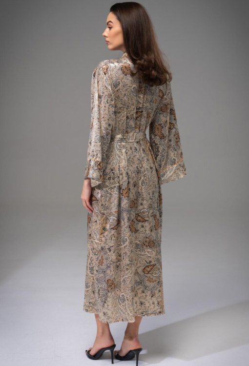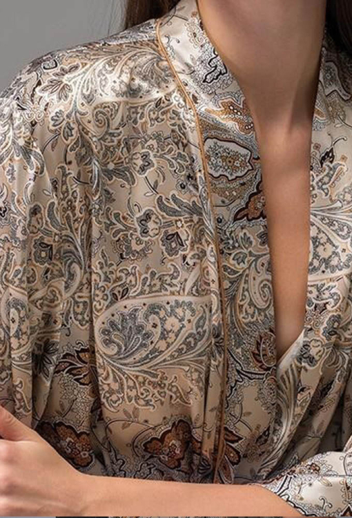 Розкішний жіночий халат із колекції Livia від італійського бренду Mia-Amore. Халат виконаний із сумішевого полотна на основі натурального шовку, бежевого кольору в східний принт коричневого та сірого кольору, вільного силуету та довжиною нижче колін. Модель з рукавами 7/8 та зручними бічними кишенями, зав'язується на запах за допомогою пояса, лінія вирізу, полиці та рукави прикрашені тонким кантом бежевого кольору. Халат дуже красивий та комфортний, ідеальний для домашнього користування та відмінний варіант для подарунка!