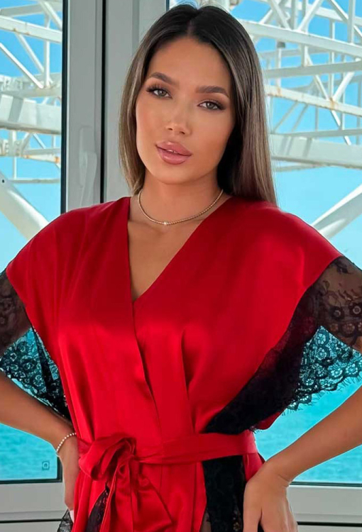 Сексуальний жіночий халат від українського бренду Silk Kiss. Халат виконаний з м'якого та якісного натурального шовку червоного кольору, вільного силуету та з короткими рукавами. Модель довжиною вище колін зав'язується на запах за допомогою широкого пояса, прикрашеного чорним мереживом на кінцях. Бічні лінії виробу, включаючи рукави, оздоблені широкими вставками з ажурного мережива чорного кольору та спокусливими розрізами. Халат дуже красивий і комфортний, додасть витонченості образу та подарує приємні відчуття на тілі. Виріб упакований у фірмову коробку – чудовий подарунок для коханих та близьких людей!
