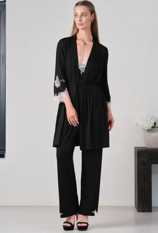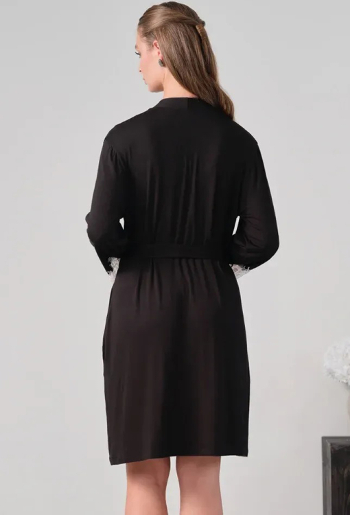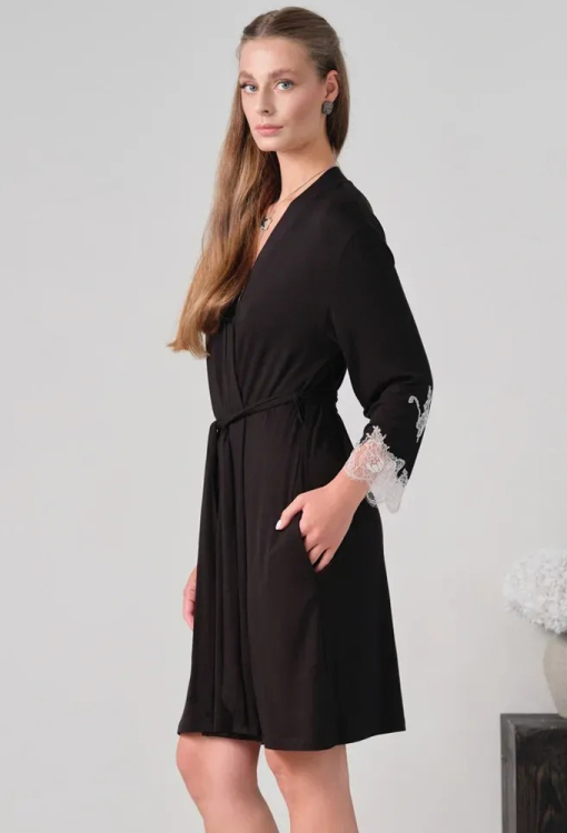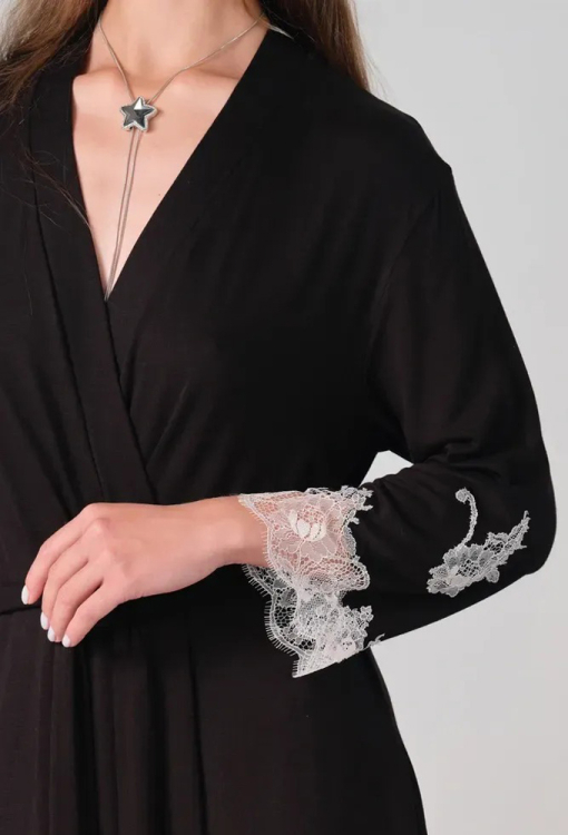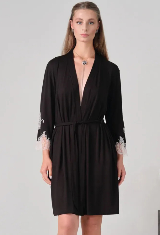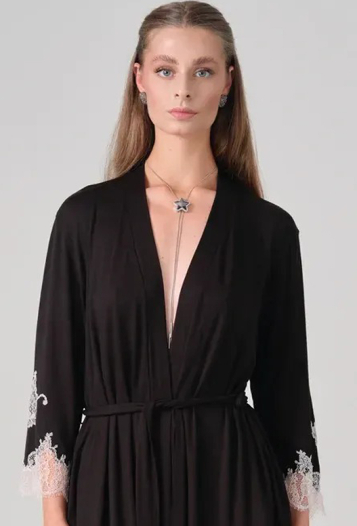 Елегантний жіночий халат із колекції Core від італійського бренду Effetto. Халат виконаний з м'якого та якісного бамбука чорного кольору, вільного силуету та довжиною вище колін. Модель із рукавами 7/8 зав'язується на запах за допомогою пояса, рукави виробу прикрашені вставками із вишуканого італійського мережива кремового кольору. Халат дуже красивий і комфортний, дозволить створити стильний образ для домашнього відпочинку, а також може бути чудовим подарунком коханій та близькій людині.