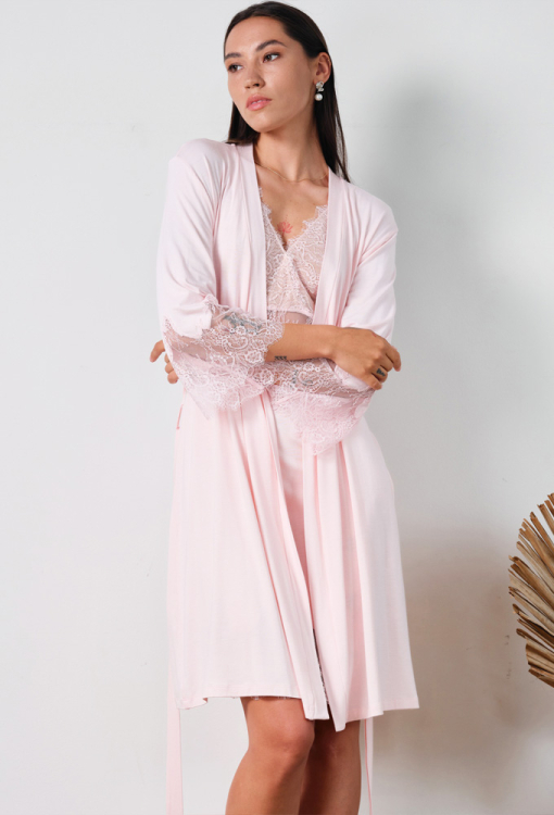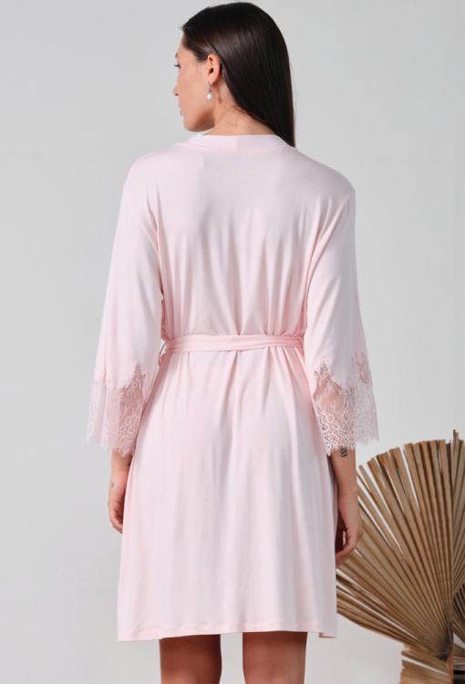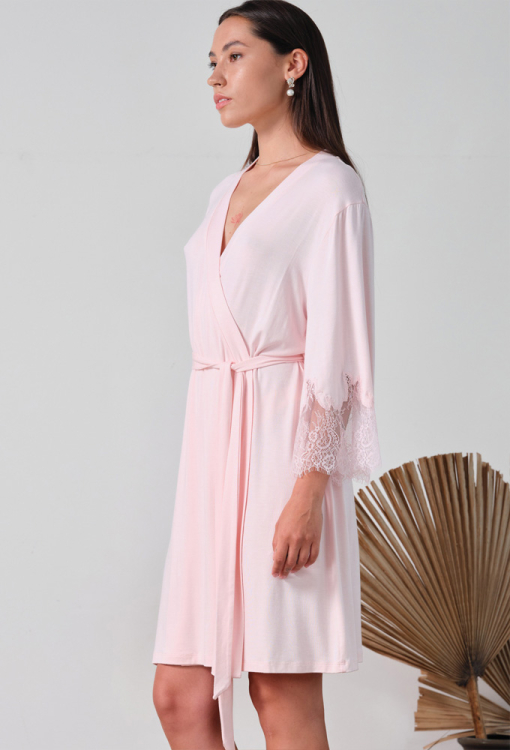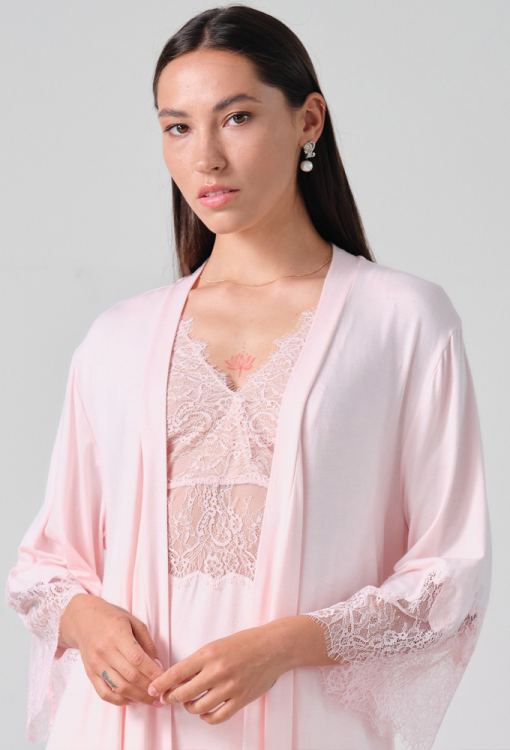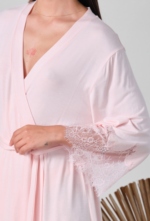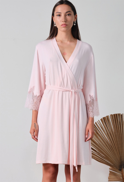 Ніжний жіночий халат із колекції Elegent Enigma від італійського бренду Effetto. Халат виконаний з м'якого та якісного бамбука рожевого кольору, вільного силуету та довжиною вище колін. Модель з рукавами 3/4, зав'язується на запах за допомогою пояса, рукави виробу прикрашені широкими вставками із фігурно вирізаного мережива. Халат дуже красивий і комфортний, дозволить створити стильний образ для домашнього відпочинку, а також може бути чудовим подарунком коханій та близькій людині.