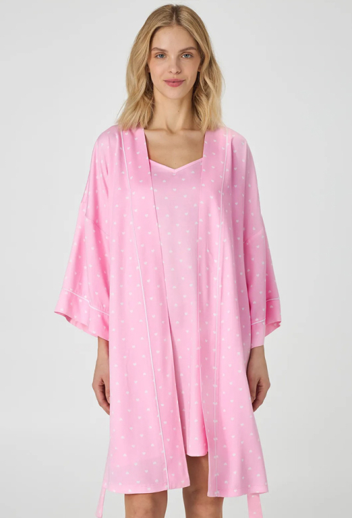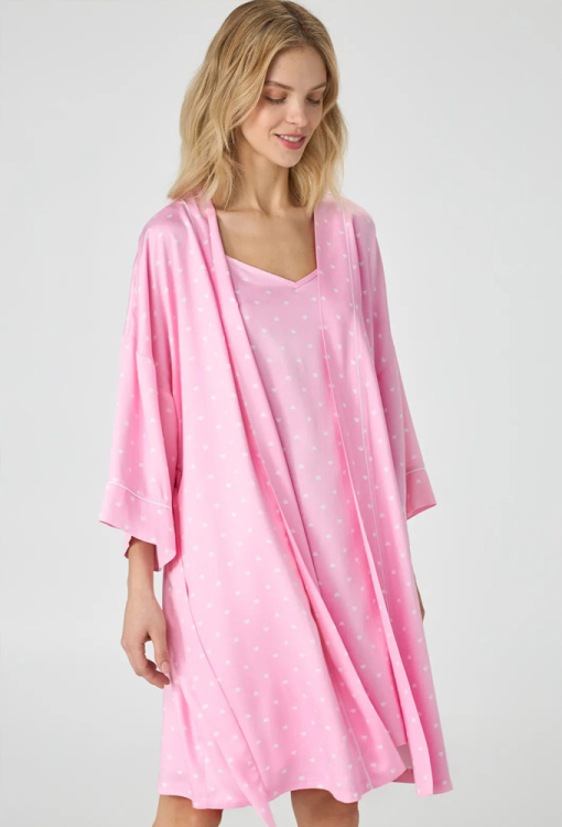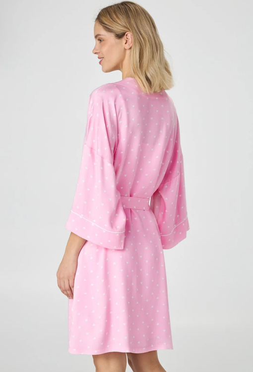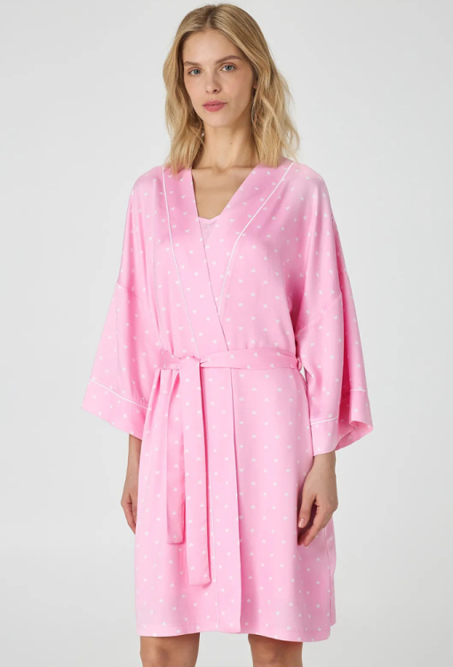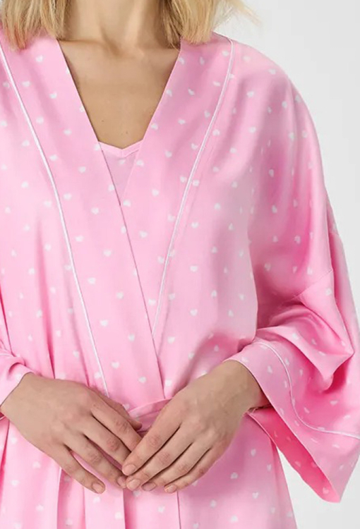 Легкий жіночий халат із колекції Pink Love від українського бренду Ellen. Халат виконаний з якісного та м'якого батисту рожевого кольору в принт з дрібних білих сердець, вільного силуету та довжиною вище колін. Модель із рукавами 7/8 та заниженим плечовим швом, зав'язується на запах за допомогою пояса. Виріз, борти та рукави виробу прикрашені тонким кантом білого кольору. Халат дуже красивий і комфортний, ідеальний варіант для домашнього затишку, також може бути чудовим подарунком коханій або близькій людині.