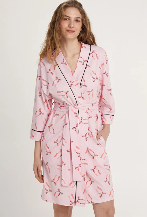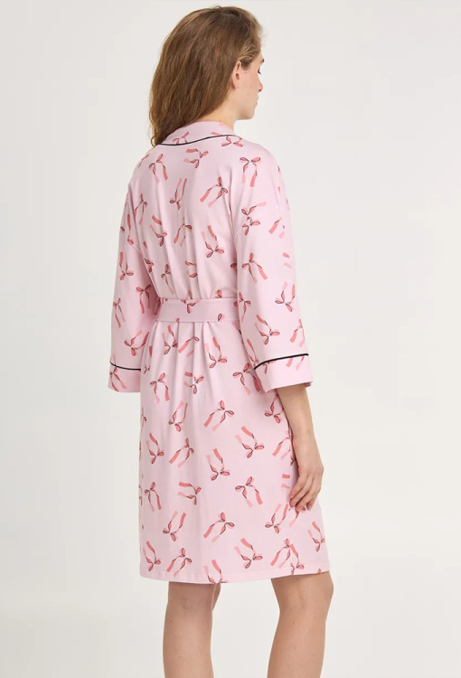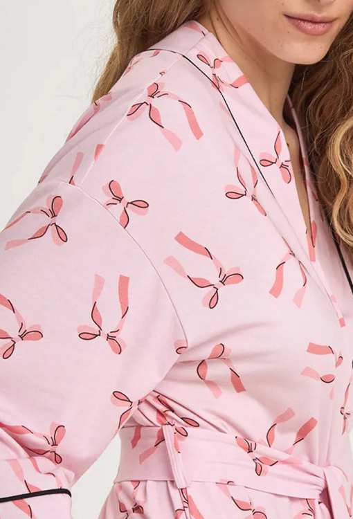 Чарівний жіночий халат із колекції Flirty від українського бренду Ellen. Халат виконаний з якісної та м'якої бавовни, рожевого кольору в принт у вигляді бантиків з чорним контуром, вільного силуету та довжиною вище колін. Модель із рукавами 3/4 та зручними бічними кишенями, зав'язується на запах за допомогою пояса. Виріз, борти та рукави виробу прикрашені тонким кантом чорного кольору. Халат дуже красивий і комфортний, має чудову повітропроникність, не сковує рухів, ідеальний для будинку або подарунка коханій та близькій людині.