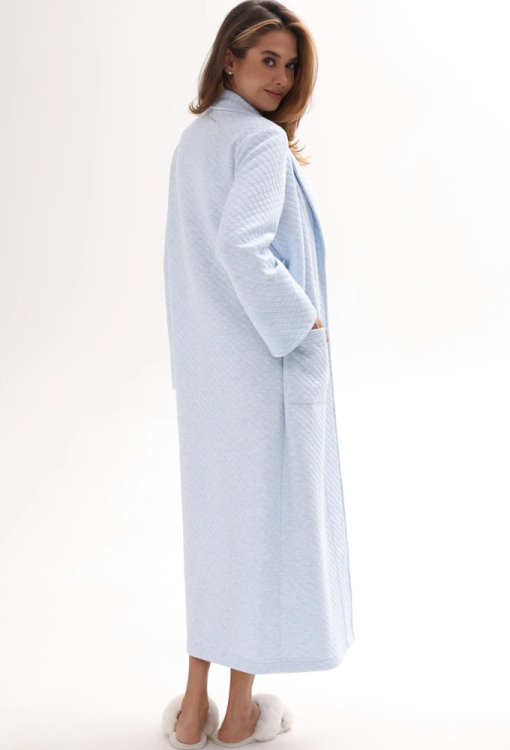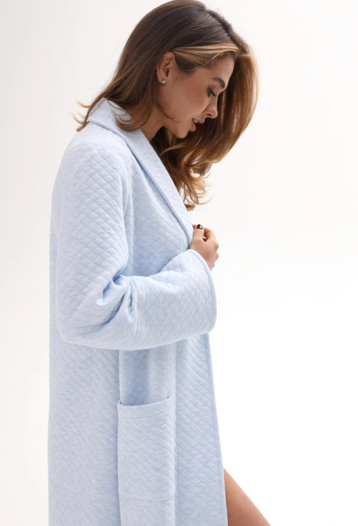 Елегантний довгий жіночий халат від українського бренду German Volf. Халат виконаний зі стьобаного утепленого трикотажу, блакитного кольору, з шалевим коміром та зручними накладними кишенями. Модель зав'язується на запах за допомогою пояса та зав'язок усередині, довжина рукава регулюється підкатом. Халат дуже красивий і комфортний, також може бути чудовим подарунком близькій чи коханій людині!