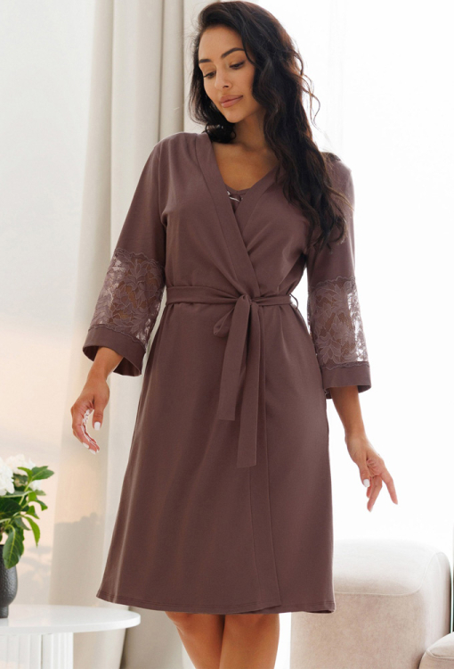 Прекрасний жіночий халат із колекції Обійми від українського бренду Roksana. Халат виконаний з м'якої та якісної бавовни коричневого кольору, з рукавами 3/4 та довжиною трохи вище колін. Модель вільного силуету та зав'язується на запах за допомогою пояса, рукави прикрашені широкими вставками з ажурного мережива. Виріб ідеально підійде як для ранкового, так і для вечірнього домашнього образу. Халат дуже красивий і комфортний, також може бути відмінним подарунком коханій та близькій людині.