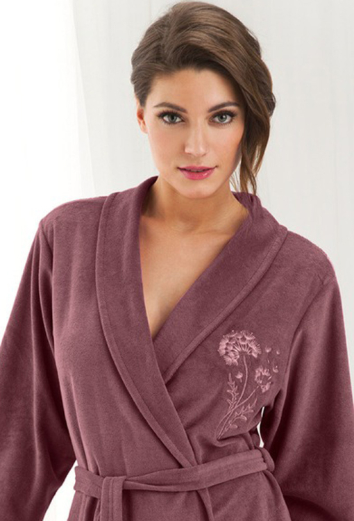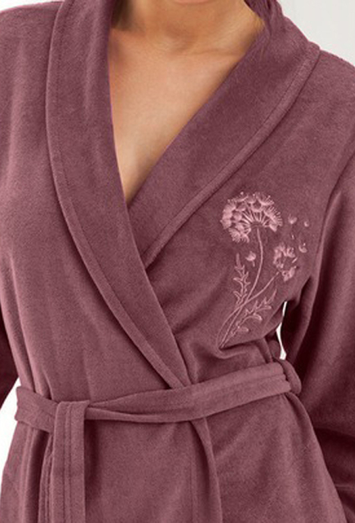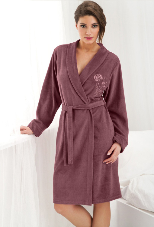 Класичний жіночий халат від польського бренду Dorota. Халат виконаний з м'якої, якісної тонкої махри на основі натуральної бавовни сливового кольору, з довгими рукавами та коміром шаль. Модель довжиною трохи вище колін й зі зручними бічними кишенями, зав'язується на запах за допомогою пояса. На грудях ліворуч виріб прикрашений гарною квітковою вишивкою, рукави оброблені вільними манжетами. Халат дуже красивий і комфортний, буде зручним варіантом домашнього одягу та чудовим подарунком для коханої людини.