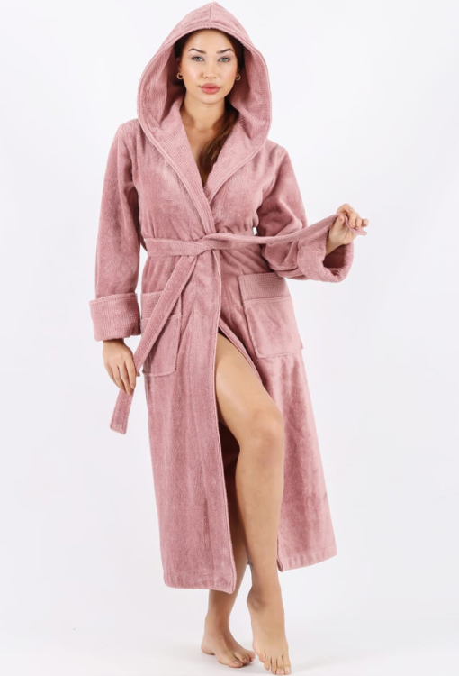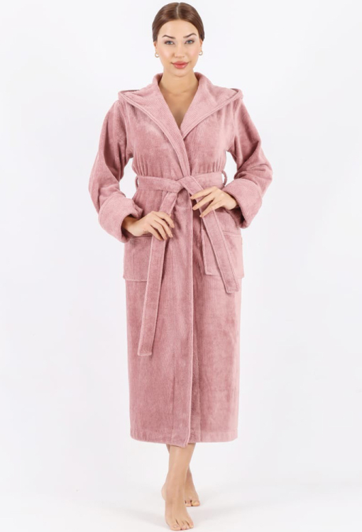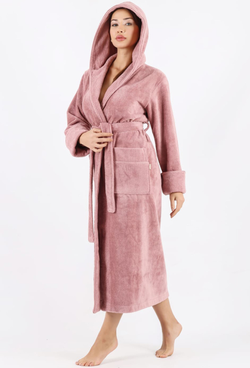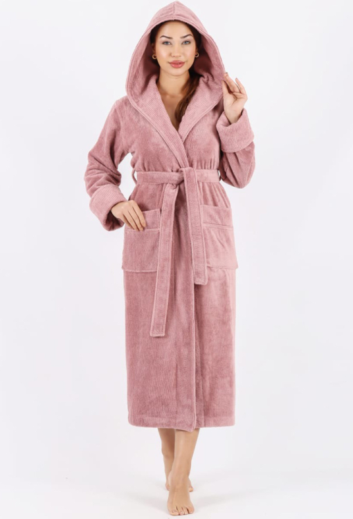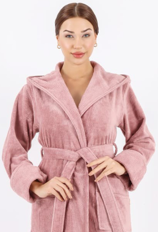 Теплий жіночий халат від турецького бренду Nusa. Халат виконаний з м'якої та якісної махри пудрового кольору, вільного силуету та довжиною нижче колін. Модель з довгими рукавами, капюшоном та зручними накладними кишенями, зав'язується на запах за допомогою пояса. Рукави виробу оброблені відкладними манжетами з фактурної махри, капюшон і кишені також оздоблені махрою з тисненим візерунком. Халат дуже красивий і приємний до тіла, відмінно вбирає вологу і дозволяє тілу дихати, ідеальний після ванни або інших водних процедур, а також може бути корисним подарунком коханій та близькій людині.