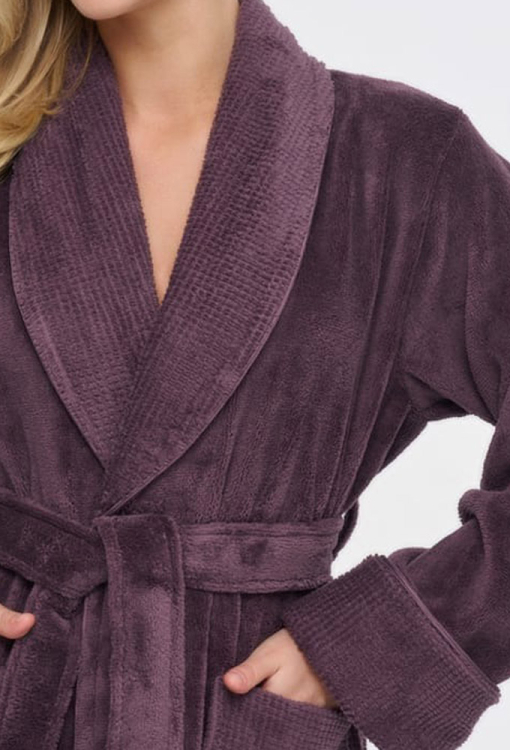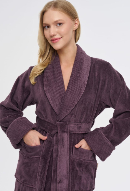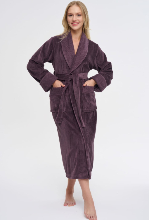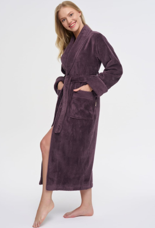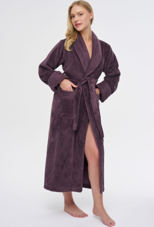 Елегантний жіночий халат від турецького бренду Nusa. Халат виконаний з м'якої та якісної махри фіолетового кольору, вільного силуету та довжиною нижче колін. Модель з довгими рукавами, коміром шаль та зручними накладними кишенями, зав'язується на запах за допомогою пояса. Рукави виробу оброблені відкладними манжетами з фактурної махри, комір і кишені також оздоблені махрою з тисненим візерунком. Халат дуже красивий і приємний до тіла, відмінно вбирає вологу і дозволяє тілу дихати, ідеальний після ванни або інших водних процедур, а також може бути корисним подарунком коханій та близькій людині.