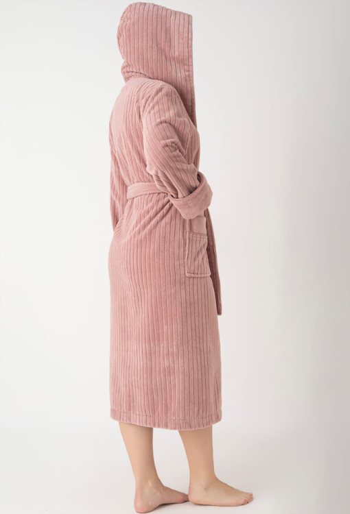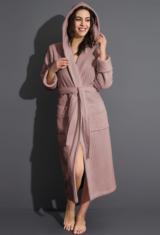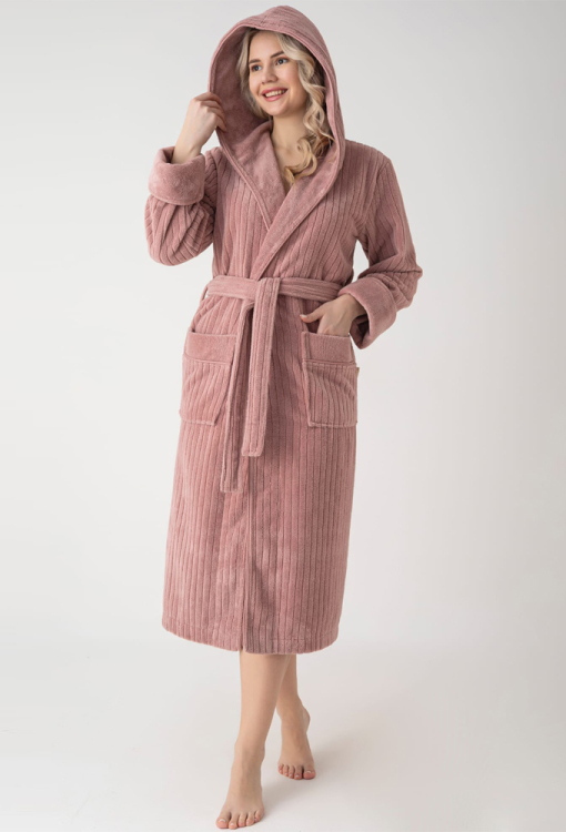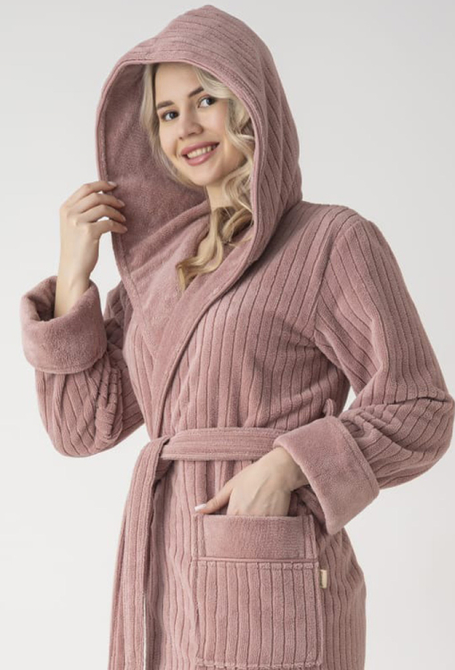 Красивий жіночий халат від турецького бренду Nusa. Халат виконаний з м'якої та якісної махри з набивною фактурою у вигляді смуг пудрового кольору, вільного силуету та довжиною нижче колін. Модель з довгими рукавами, капюшоном та зручними накладними кишенями, зав'язується на запах за допомогою пояса. Рукави виробу оброблені відкладними манжетами з гладкої махри, капюшон та кишені також прикрашені однотонною тканиною. Халат стильний і дуже комфортний, відмінно вбирає вологу і дозволяє тілу дихати, ідеальний після ванни або інших водних процедур, а також може бути корисним подарунком коханій та близькій людині.