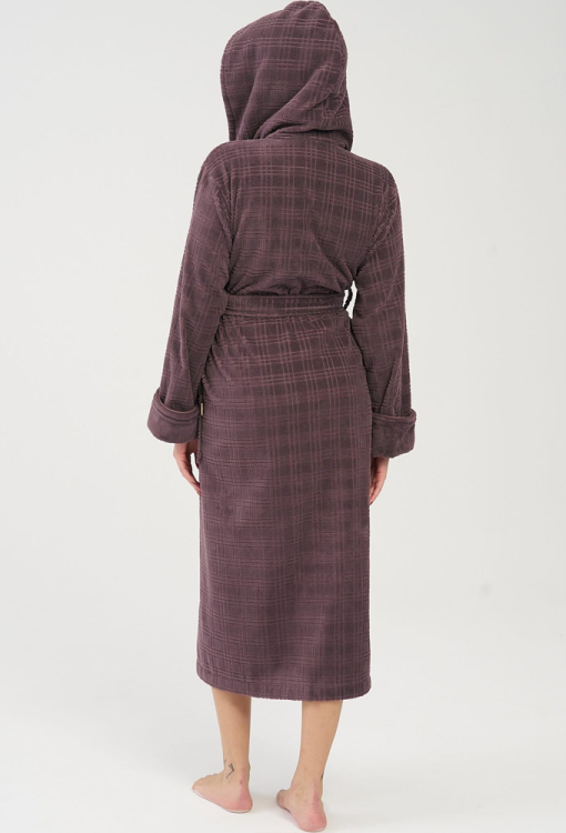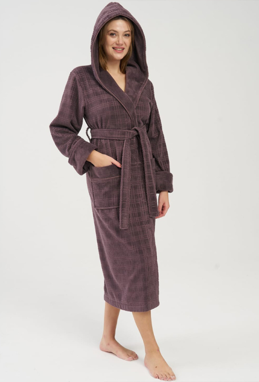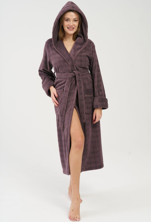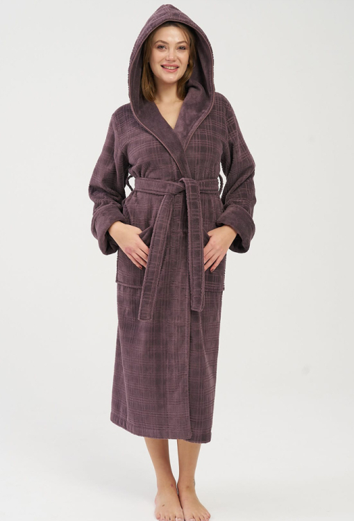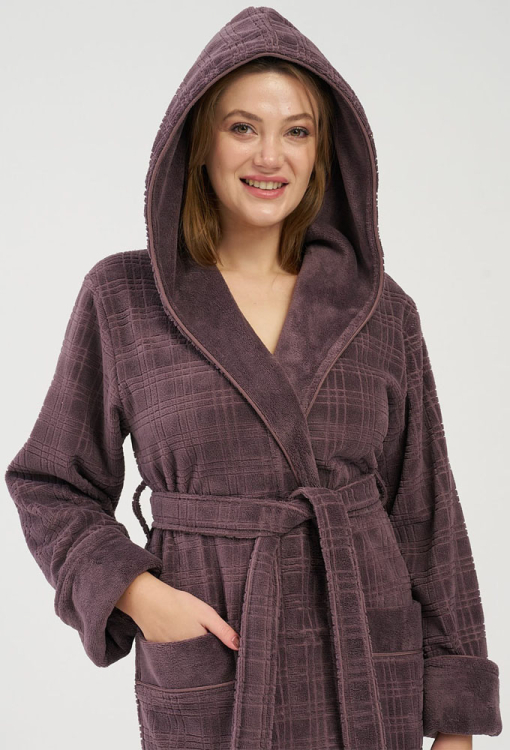 Стильний жіночий халат від турецького бренду Nusa. Халат виконаний з м'якої та якісної махри з тисненою картатою фактурою фіолетового кольору, вільного силуету та довжиною нижче колін. Модель з довгими рукавами, капюшоном та зручними накладними кишенями, зав'язується на запах за допомогою пояса. Рукави виробу оброблені відкладними манжетами з гладкої махри, капюшон та кишені також прикрашені однотонною тканиною. Халат красивий і дуже комфортний, відмінно вбирає вологу і дозволяє тілу дихати, ідеальний після ванни або інших водних процедур, а також може бути корисним подарунком коханій та близькій людині.