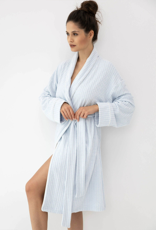 Елегантний жіночий халат Zoya від польського бренду Sensis. Халат виконаний з якісної та м'якої махри з тисненою фактурою клітикна блакитного кольору, з довгими рукавами та коміром шаль. Модель вільного силуету та довжиною трохи нижче колін, зав'язується на запах за допомогою пояса. Комір та рукави вироби прикрашені тонким кантом білого кольору. Халат дуже красивий і комфортний, відмінно вбирає вологу, можна використовувати відразу після купання, а також підійде як подарунок коханій або близькій людині.