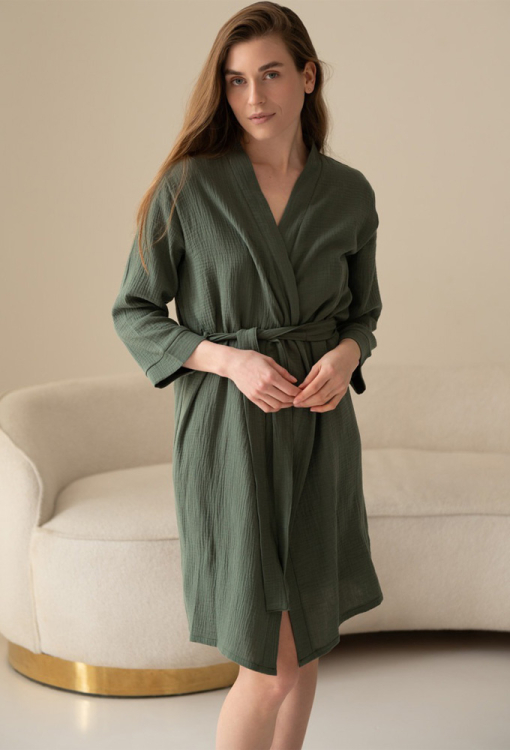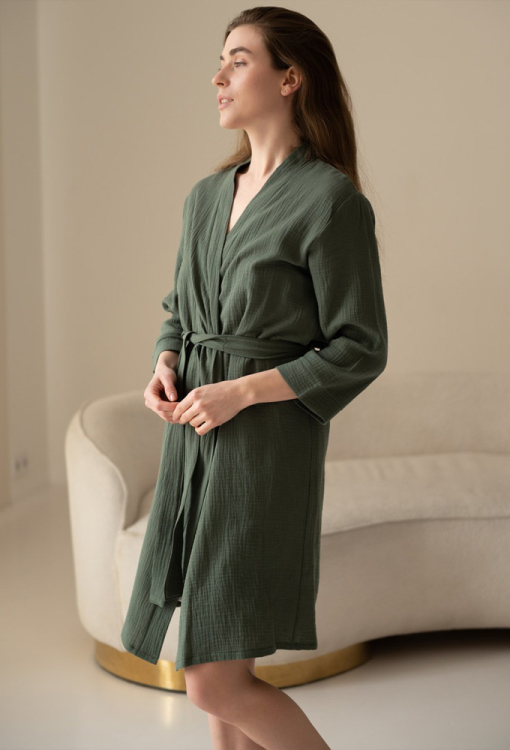 Легкий жіночий халат від українського бренду LoomLine. Халат виконаний з якісного та м'якого двошарового мусліну темно-зеленого кольору, вільного крою та з рукавами 3/4. Модель довжиною вище колін із вільними манжетами на рукавах, зав'язується на запах за допомогою пояса та зав'язок усередині. Халат дуже гарний та комфортний, ідеальний для домашнього користування, а також може бути чудовим подарунком коханій та близькій людині.