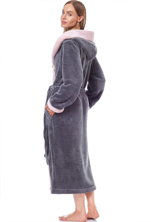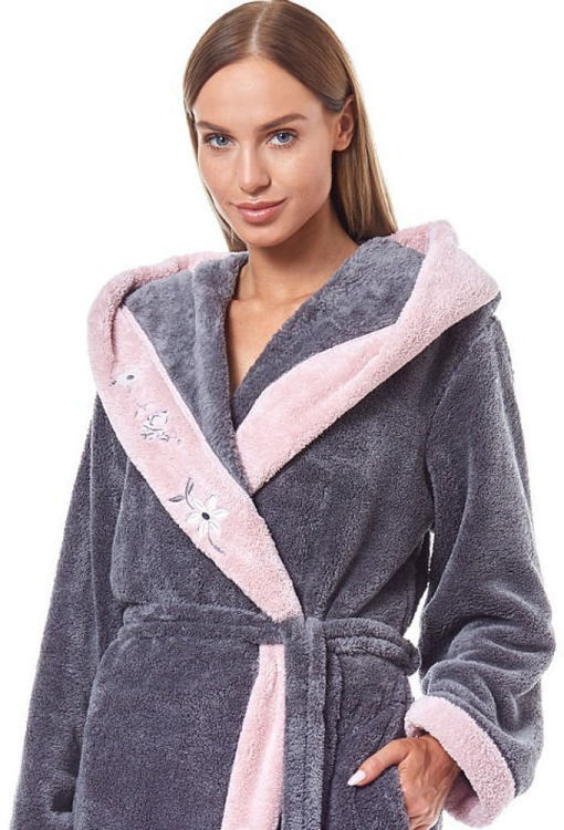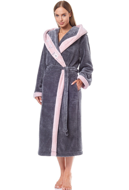 Теплий жіночий халат Hft від польського бренду L&L. Халат виконаний з якісного та м'якого плюшу графітового кольору, вільного силуету та довжиною нижче колін. Модель з довгими рукавами, капюшоном і зручними кишенями, зав'язується на запах за допомогою пояса. Капюшон, полиці та рукави виробу оброблені вставками із плюшу рожевого кольору, капюшон прикрашений кольоровою вишивкою. Халат гарний і дуже комфортний, ідеальний для домашнього користування в холодну пору, а також може бути корисним подарунком коханій та близькій людині.