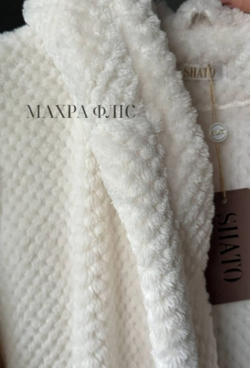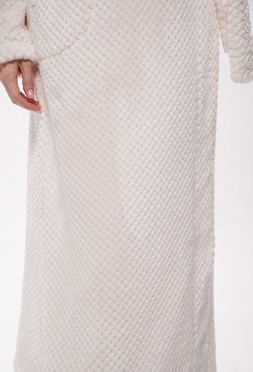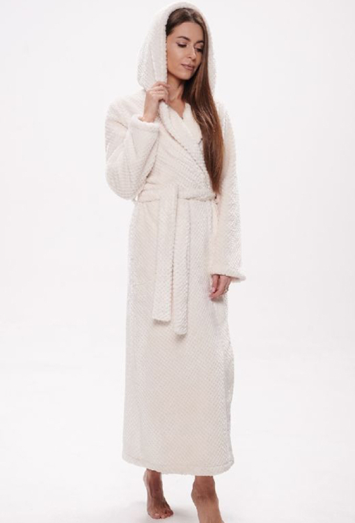 Елегантний жіночий халат від українського бренду Shato. Халат виконаний з якісного та м'якого плюшу з фактурним візерунком кремового кольору, вільного силуету та довжиною до підлоги. Модель з довгими рукавами, капюшоном та зручними бічними кишенями, зав'язується на запах за допомогою пояса. Халат дуже красивий і комфортний, зігріє прохолодним ранком або ввечері, а також буде чудовим подарунком для коханої чи близької людини.