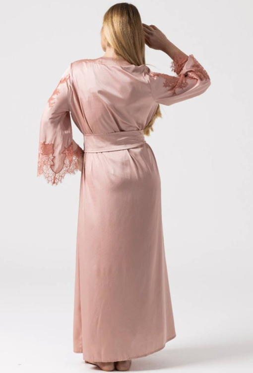 Розкішний жіночий халат із колекції Ash Rose від українського бренду Felena. Халат виконаний з м'якого та якісного віскозного шовку рожевого кольору, вільного силуету та довжиною в підлогу. Модель із довгими розширеними рукавами зав'язується на запах за допомогою пояса. Рукави вздовж і внизу прикрашені вирізними вставками із шикарного ажурного мережива темно-рожевого кольору. Халат дуже красивий і комфортний, підкреслить елегантність домашнього образу, а також може бути чудовим подарунком коханій та близькій людині!