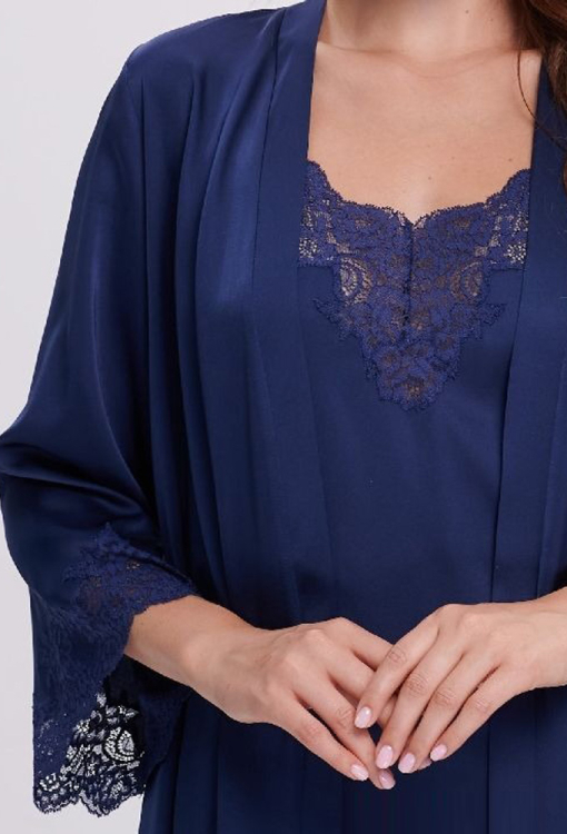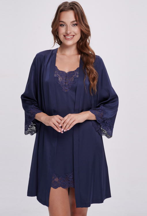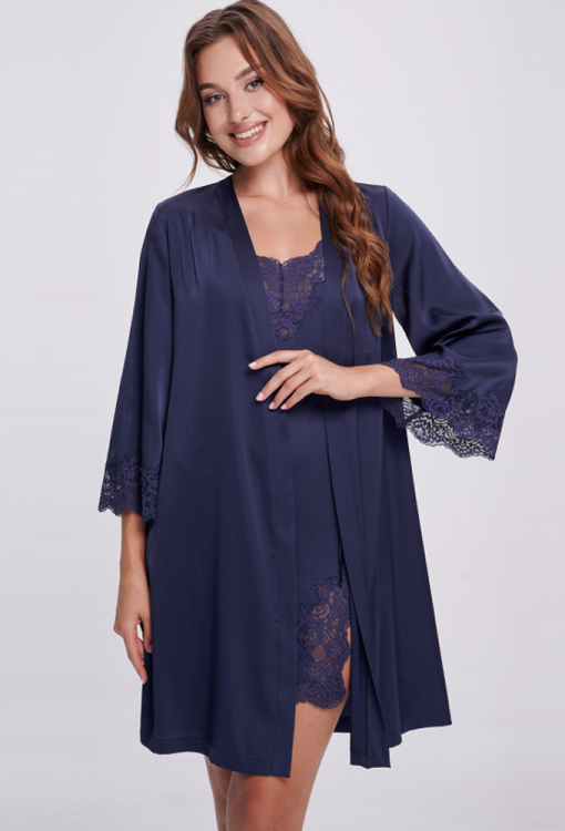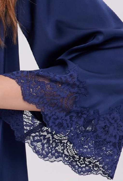 Чарівний жіночий халат від українського бренду Shato - вишукане поєднання елегантності, жіночності та витонченого комфорту. Халат виконаний з якісного, м'якого та приємного до тіла шовку Армані темно-синього кольору, має класичний крій та довжину вище колін, красиво підкреслюючи силует. Злегка розширені рукави довжиною 3/4 надають образу легкість та витонченість, а запах із поясом дозволяє підкреслити талію та забезпечити комфортну посадку. Рукави прикрашені фігурними вставками з ніжного квіткового мережива, що додають моделі особливий шарм та романтичність. Халат неймовірно красивий і зручний, ідеально підходить для вечірнього відпочинку та ранкових ритуалів, а також стане чудовим подарунком для коханої чи близької людини.