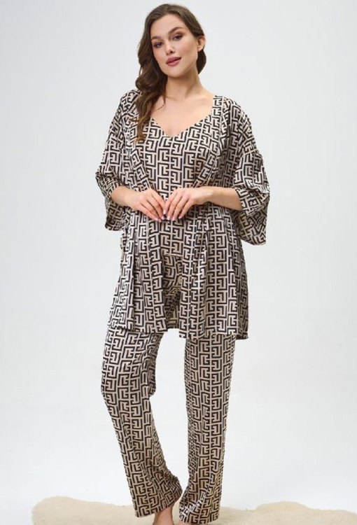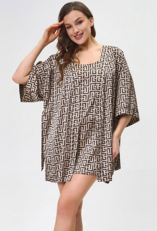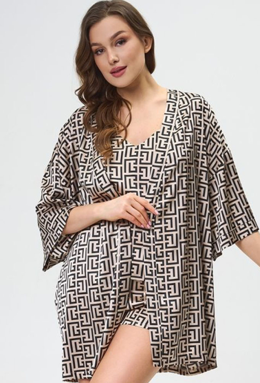 Короткий жіночий халат від українського бренду Shato. Халат виконаний з якісного та м'якого шовку Армані, бежевого кольору з чорним графічним принтом у грецькому стилі, вільного крою та з рукавами 3/4. Модель з розширеними рукавами та приспущеною лінією плеча зав'язується на запах за допомогою пояса. Халат дуже красивий і комфортний, ідеальний для домашнього користування, також може бути чудовим подарунком коханій або близькій людині.