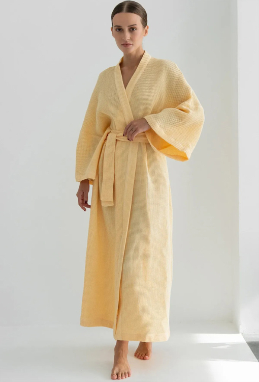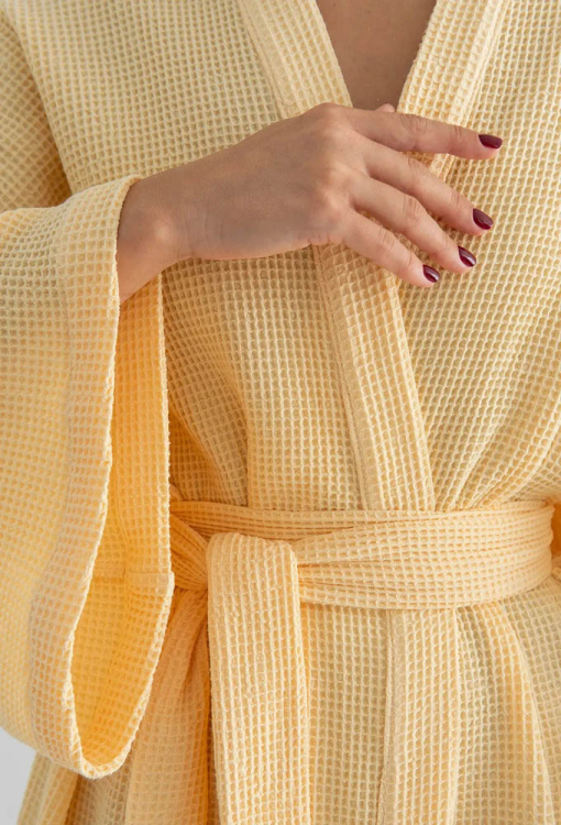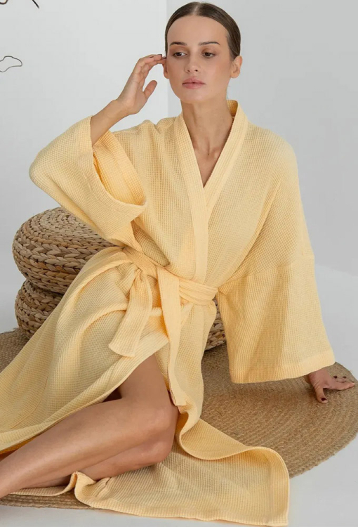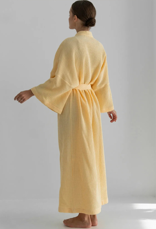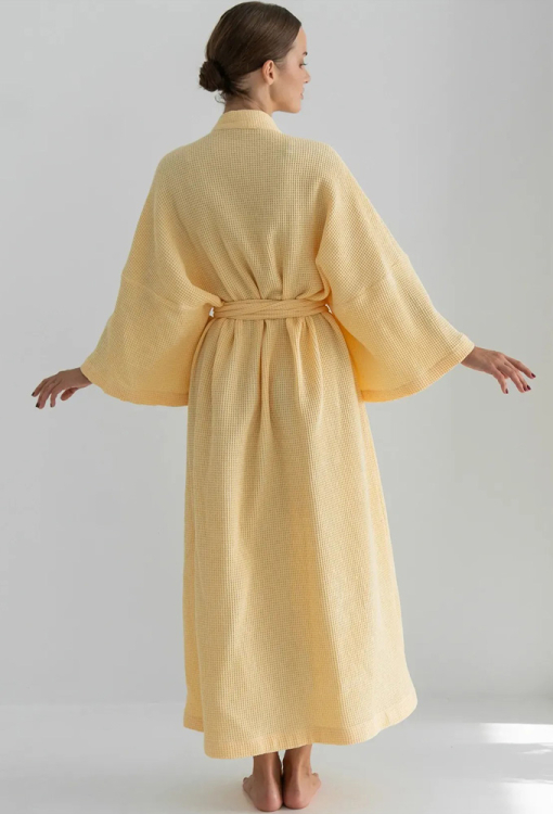 Зручний жіночий халат кімоно Canary від українського бренду Forly. Халат виконаний з якісного та м'якого вафельного полотна жовтого кольору та довжиною в підлогу. Модель вільного силуету з довгими розширеними рукавами й заниженим плечовим швом зав'язується на запах за допомогою широкого довгого пояса. Завдяки високій якості матеріалу, виріб не дає усадку, практично і просто у догляді. Халат дуже красивий і приємний до тіла, підкреслить привабливість жіночого домашнього образу, а також може бути чудовим подарунком коханій та близькій людині.